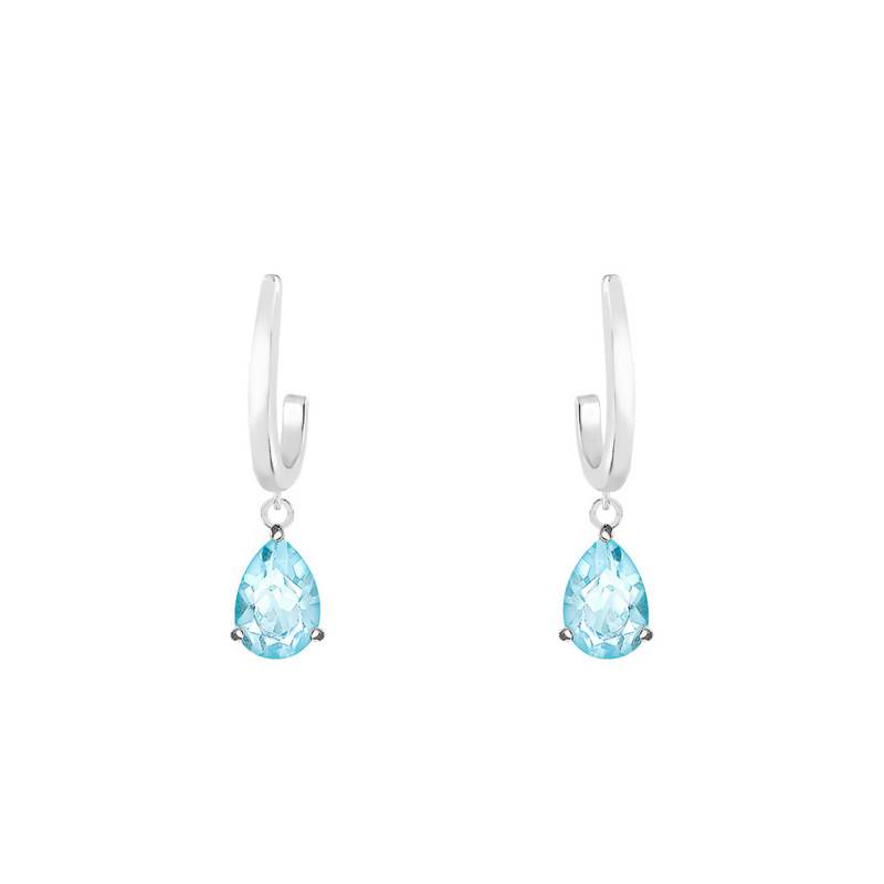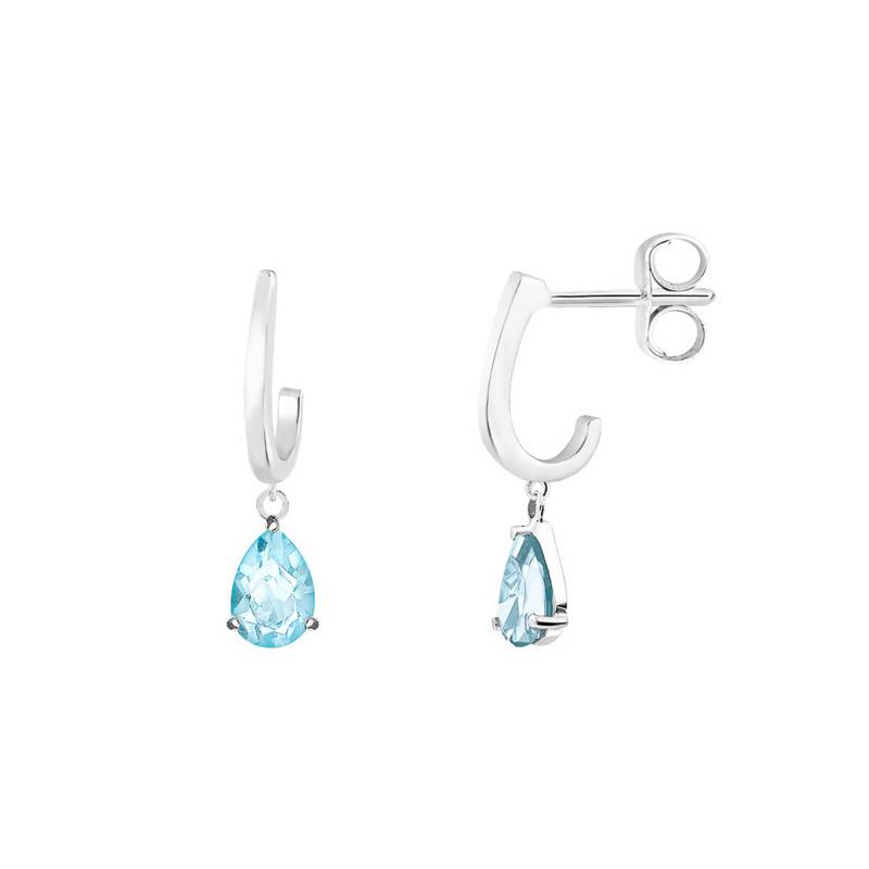 Succombez à cette splendide paire de boucles d'oreilles pendantes proposée en or blanc 375/1000 (9K) ou 750/1000 (18K). Elles sont chacune accompagnée d'une pierre d'Aigue-marine bleue qui amènera de l'originalité et de la classe à vos oreilles. Chaque pierre mesure 5 sur 8 mm. Elles ont une hauteur de 16,80 mm, le poids moyen d'or de ces boucles d'oreilles est de 1,40g pour 375/1000 (9K) et 1,80g pour 750/1000 (18K). Le fermoir de type poussette papillon, très sécurisé vous permettra de les enlever et les remettre facilement à votre guise.