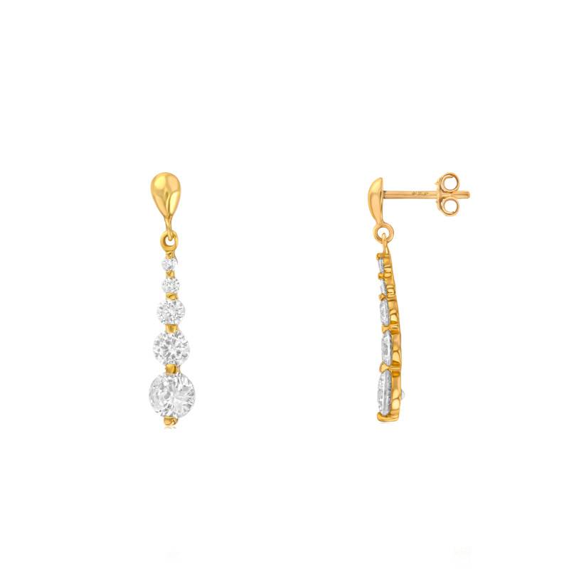 Découvrez cette paire de Boucles d'Oreilles en or jaune 375/1000 (9K), sublimée par des oxydes de zirconium de tailles variées. Leur design élancé apporte éclat et modernité à l'ensemble. Chaque boucle mesure 25 mm de hauteur pour 5 mm de largeur, et associe harmonieusement les tons blancs et dorés pour un rendu lumineux et élégant. Elles se fixent facilement grâce à un fermoir poussettes papillon, assurant un maintien sûr et confortable au quotidien.