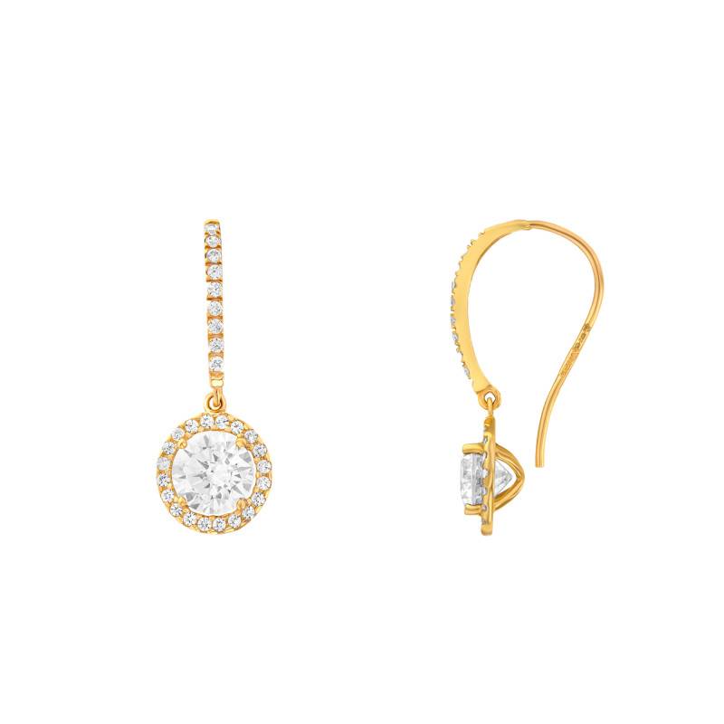 Cette paire de Boucles d'Oreilles en or jaune 375/1000 (9K) séduit par son style lumineux et féminin. Chaque boucle mesure 27 mm de hauteur pour 9,5 mm de largeur et se compose d'un crochet pavé d'oxydes de zirconium blancs, apportant une touche éclatante au visage. Une pièce ronde, également ornée d'oxydes de zirconium sertis sur le contour, vient compléter ce design délicat et sophistiqué. La finition polie de l'or souligne la brillance du bijou et met en valeur l'éclat des pierres. Elles se fixent facilement grâce à un fermoir crochet, assurant un porté confortable au quotidien.