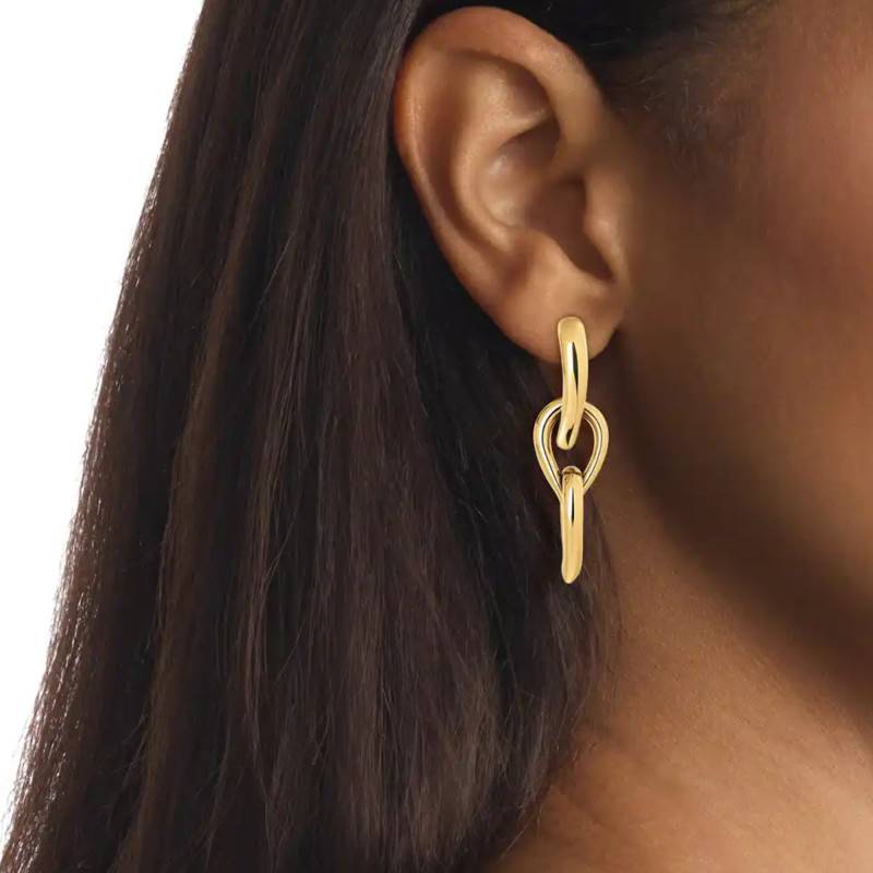 Ces boucles d'oreilles pendantes Sculptured Drops en acier doré captivent par leur design délicat et audacieux. Un entrelacs de maillons, baigné dans une lueur de PVD jaune, évoque la fluidité et la lumière. Leur couleur jaune resplendit, enveloppant le visage dans une aura chaleureuse et lumineuse. Ces trésors précieux pèsent 20,80 g, et incarnent à merveille l'équilibre entre robustesse et finesse, tout en bénéficiant d'une garantie de 2 ans.