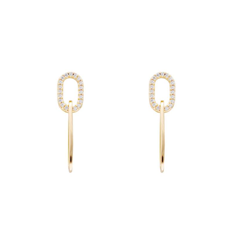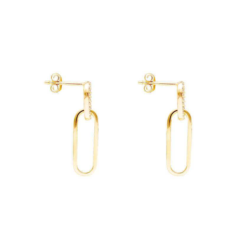 Laissez-vous séduire par les boucles d'oreilles pendantes Sully en plaqué or et oxyde de zirconium, une création où l'éclat du doré s'allie à la brillance cristalline. Réalisées en plaqué or 3 microns, elles se distinguent par une finition polie et lumineuse qui sublime chaque reflet.
