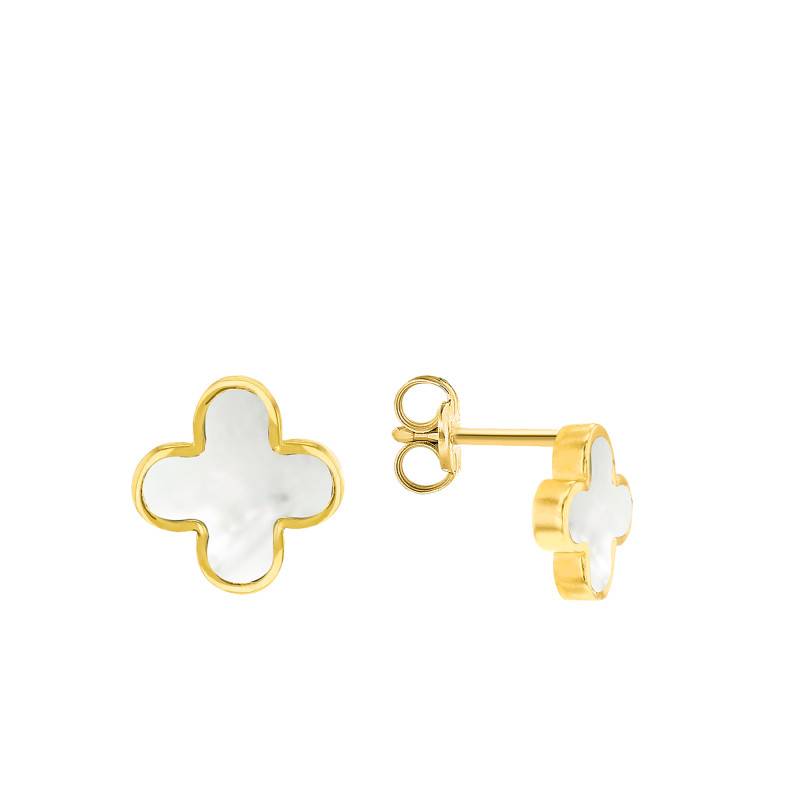 Ces ravissantes boucles d'oreilles trèfles se démarquent par leur forme qui captive l'attention. De couleur dorée, elles comprennent des nacres blanches serties clos qui les magnifient. Cette gemme est réputée pour contribuer à améliorer la luminosité et l'élasticité de la peau. Vous pourrez porter ce bijou aisément grâce à son fermoir poussettes papillon. Se prêtant à tous les styles, ces puces d'oreilles affichent des pétales trèfles et sont réalisées en or jaune 375/1000 (9K) avec une finition polie. Notez que les dimensions de ces boucles sont de 12,30 mm de longueur de tige, 6,50 mm de largeur et 6,50 mm de hauteur.