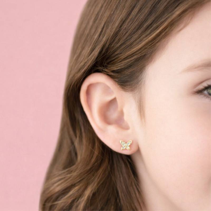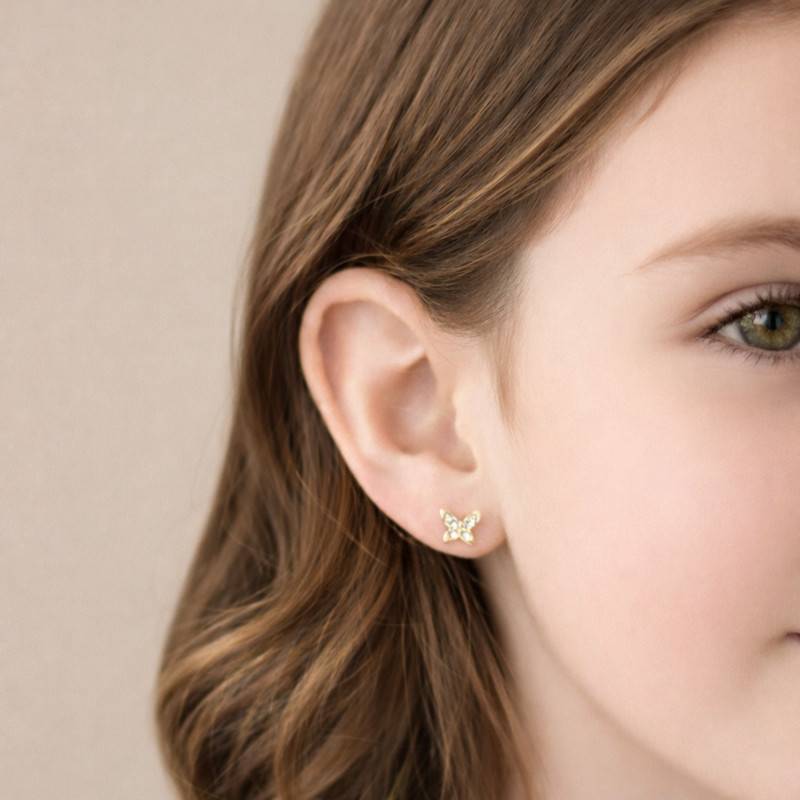 Envolez-vous vers un monde de féérie avec ces Boucles d'Oreilles Puces Papillon en Or Jaune 375 & Oxydes de Zirconium. Chaque pièce, façonnée avec amour en Or Jaune 375/1000 (9K), resplendit d'une finition polie et brillante. Les délicats oxydes de zirconium blancs, au nombre de 12, se nichent avec élégance dans un serti massé, reflétant la lumière avec une pureté étincelante. Ces puces, conçues spécialement pour les enfants, mesurent 10,00 mm de longueur, 3,20 mm de largeur, 1,20 mm d'épaisseur, et 3,50 mm de hauteur, pour un poids de 0,33 g, assurant un port confortable tout au long de la journée notamment grâce à leur fermoir à vis.