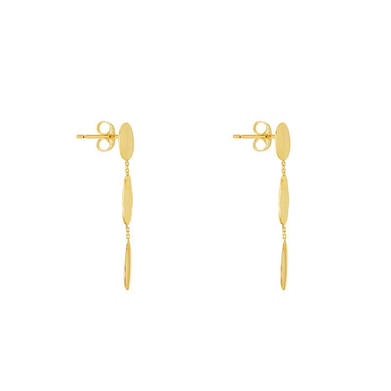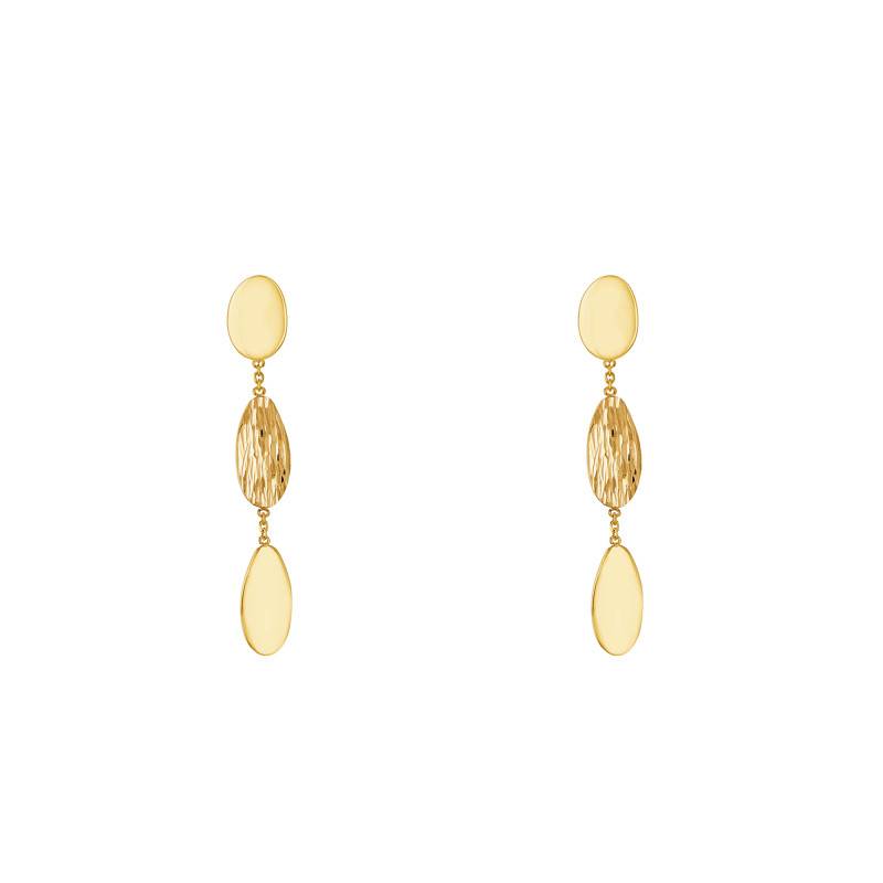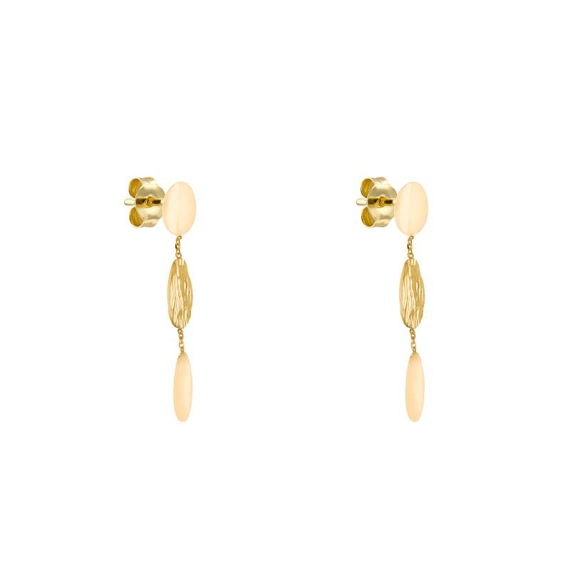 Découvrez ces boucles d'oreilles triple goutte conçues en or jaune 375/1000 (9K). Avec leur aspect élégant et raffiné, ces pendantes d'oreilles se présentent chacune sous une composition de trois gouttes. Celles-ci sont reliées entre elles par de petits anneaux. La première et la dernière gouttes arborent une finition polie, affichant une surface lisse qui capte la lumière à chaque mouvement. La goutte centrale se distingue par une finition satinée et un design texturé, apportant à l'ensemble une touche d'élégance subtile. Ces boucles d'oreilles mesurent 48 mm de hauteur sur une largeur de 8 mm pour un poids total de 3,30 grammes.