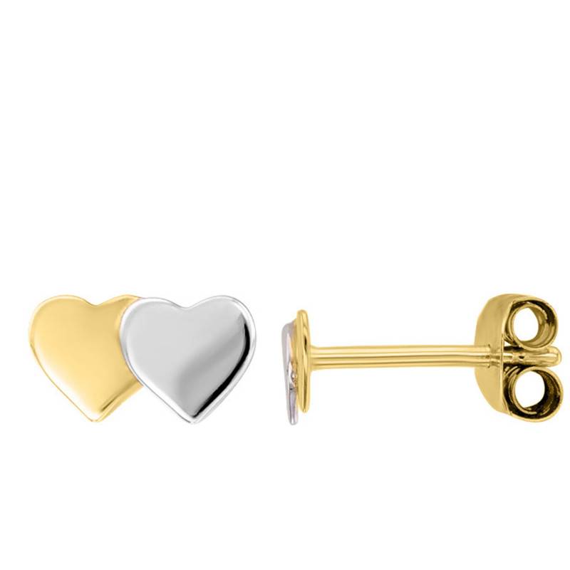 Ces ravissantes boucles d'oreilles ont été réalisé en deux ors, or blanc et or jaune 375/1000 (9K). Les puces sont composées de deux coeurs qui se chevauchent, quoi de plus romantique... Ces boucles ont comme dimensions 3 x 6 mm, ce qui les rendra discrètes et légères à porter au quotidien. Pour plus de sécurité, un fermoir de type poussette papillon a été choisi. Enfin, pour vous prouver leur légèreté, comptez un poids d'or moyen de 0,45 gramme.