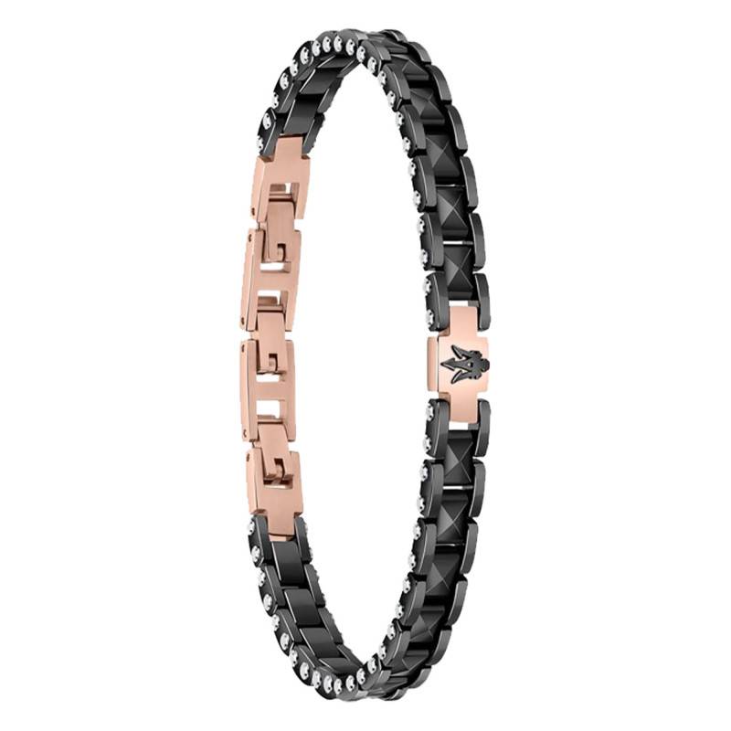 Parmi ses créations, ce bracelet en céramique et en acier inoxydable de couleur noire et rose dorée associe élégance et tendance. Il dispose en son centre d'une pièce ornée du symbole historique de la marque qui est le trident, inspiré de la fontaine de Neptune de Bologne. Pour parfaire son design, des pierres argentées sont disposées le long de ses côtés. La longueur de ce bracelet est de 21.5 cm et celui-ci s'attache sur votre poignet grâce au fermoir clipable dont il dispose.
