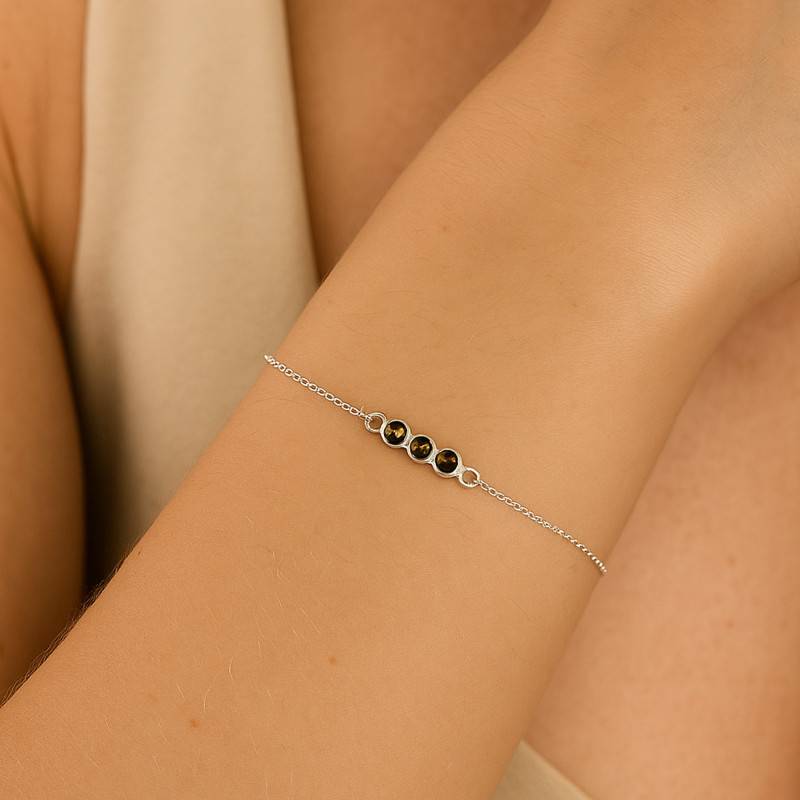Le Bracelet en Argent 925 & Ambre Vert incarne la finesse et l'harmonie. Réalisé en Argent massif 925/1000, il se distingue par sa finition polie et brillante qui met en valeur trois pierres d'ambre vert, soigneusement serties. Chaque pierre reflète la lumière avec subtilité, apportant une touche de couleur raffinée. Son pendentif serties, est d'une longueur de 18 mm pour une épaisseur de 1,5 mm. Sa longueur réglable de 16,00 à 18,00 cm, son épaisseur de 0,20 mm et son poids léger de 1,50 g assurent un confort optimal. Le fermoir mousqueton garantit une fermeture sûre et discrète. Ce bijou bénéficie d'une garantie de 2 ans, gage de qualité et de durabilité.