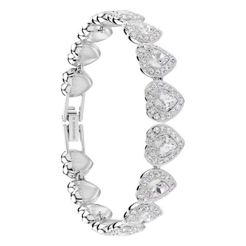 Ce bracelet cœur est issu de la collection Ariana Grande x Swarovski qui est une capsule rendant hommage à l'art du style éternel. Il est fabriqué en métal plaqué rhodium avec une finition polie. Ce modèle se compose de plusieurs motifs arborant la forme d'un cœur. Ces derniers sont sertis à grains et clos de cristaux de Swarovski blancs étincelants. Ce bracelet dispose d'une longueur ajustable de 17 à 22 cm avec une largeur de 1,90 cm. Il s'ajuste parfaitement aux poignets féminins grâce à un fermoir clipable.