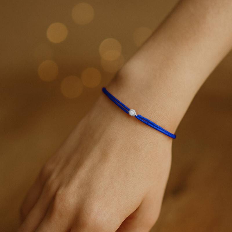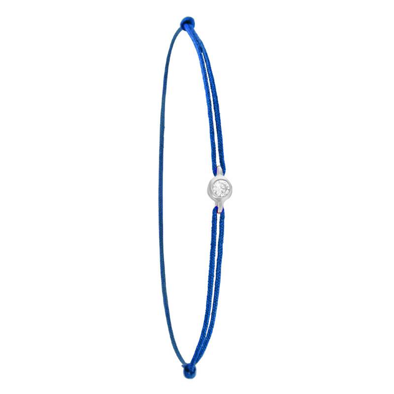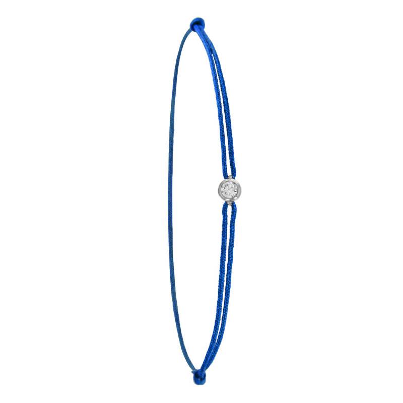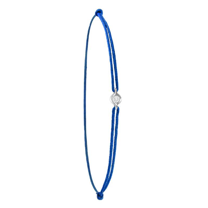 Ce bracelet, proposé par Ocarat, ajoutera le charme et l'élégance à votre poignet. Le cordon de couleur bleue fera le tour de votre main avec délicatesse. La pierre centrale qui le décore est formée à partir d'un diamant disponible en 0,02 carat, 0,06 carat, 0,11 carat et 0,15 carat entouré par un anneau en or blanc 750/1000 (18K) comme un emblème qui protège la beauté audacieuse de cette gemme prestigieuse. Ce bracelet à un système de nœud coulissant qui permet de l'adapter selon la taille de votre poignet.