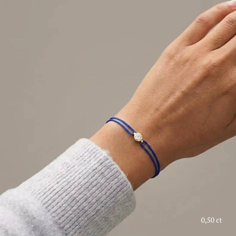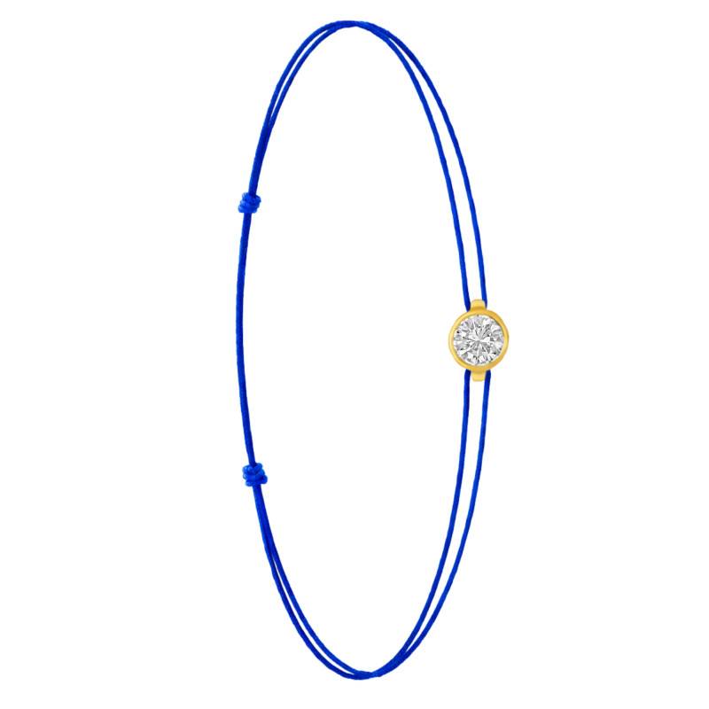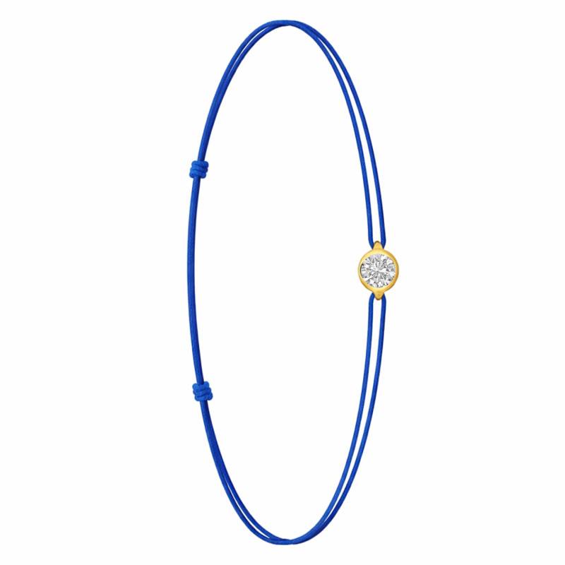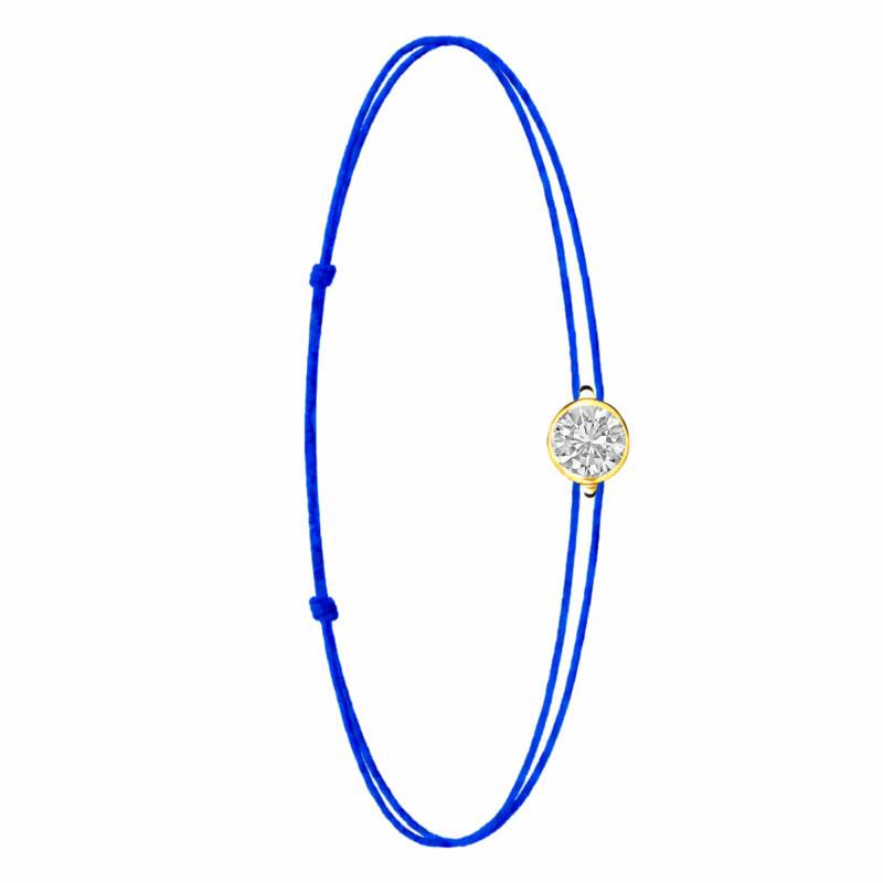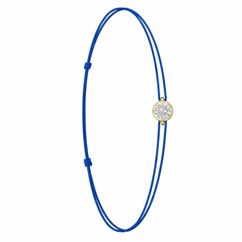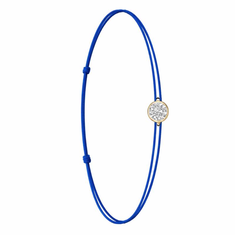 Le Bracelet Cordon Bleu en Or Jaune 750 se distingue par son design épuré et sa touche de couleur vive. Il est orné d'un diamant de synthèse cultivé en laboratoire, disponible de 0,15 ct à 0,75 ct, serti clos dans de l'or jaune 750. De couleur D et de pureté VVS2, le diamant offre une excellente brillance et une grande pureté. Les bracelets de 0,15 ct à 0,25 carat mesurent 0,80 mm d'épaisseur et sont montés sur un cordon en nylon, à la fois fin et résistant. Les modèles de 0,30 ct à 0,75 carat présentent une épaisseur de 1 mm et sont dotés d'un cordon en satin, pour un rendu plus doux et élégant. Ajustable, ce bracelet s'adapte facilement à toutes les tailles de poignet.