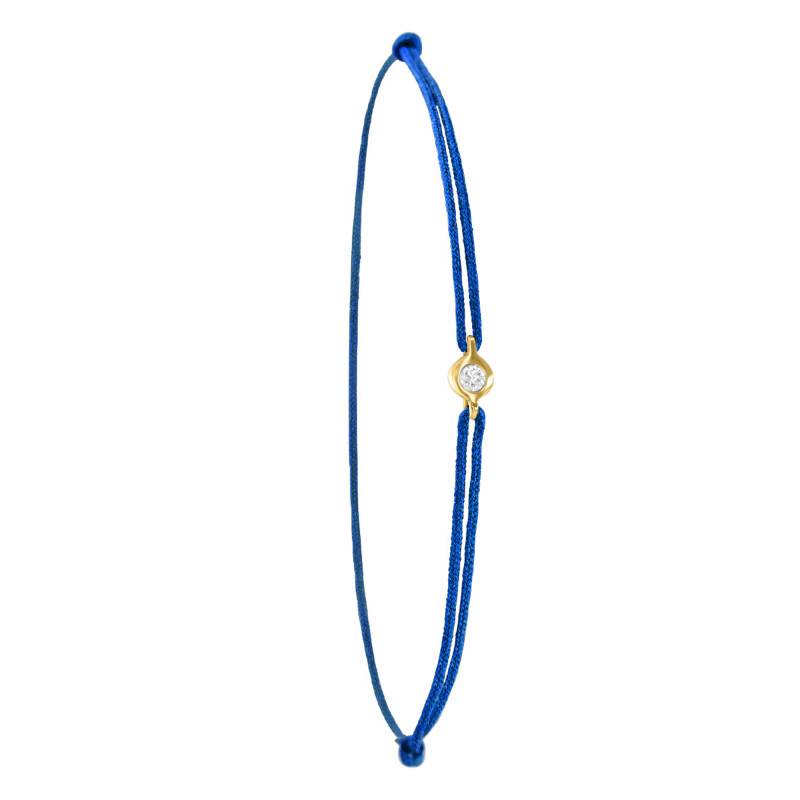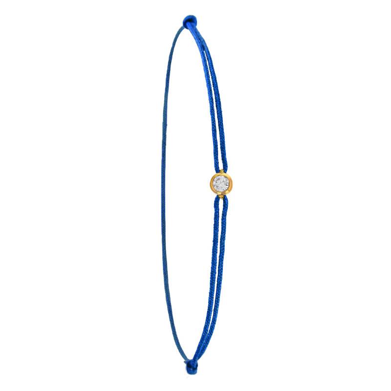 Habillez votre poignet en toute simplicité avec ce bracelet. Ce bijou présente un cordon de couleur bleu orné d'une splendide pierre en diamant disponible en un cartage allant de 0.02 carat à 0.15 carat, sertie sur de l'or jaune 750/1000 (18K) . Seul ou avec d'autres accessoires, cet ornement saura toujours compléter votre style. Vous disposez d'un fermoir nœud qui vous permettra de le manier à votre guise et en toute simplicité.