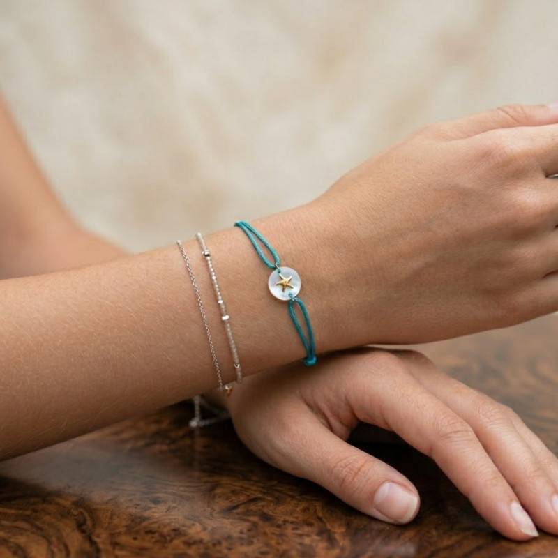 Bracelet Cordon Bleu Étoile de Mer en Or Jaune 375, Longueur 18 cm Ajustable