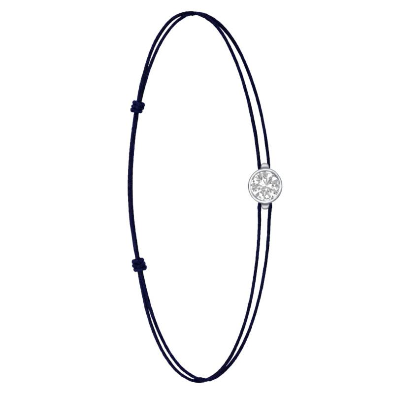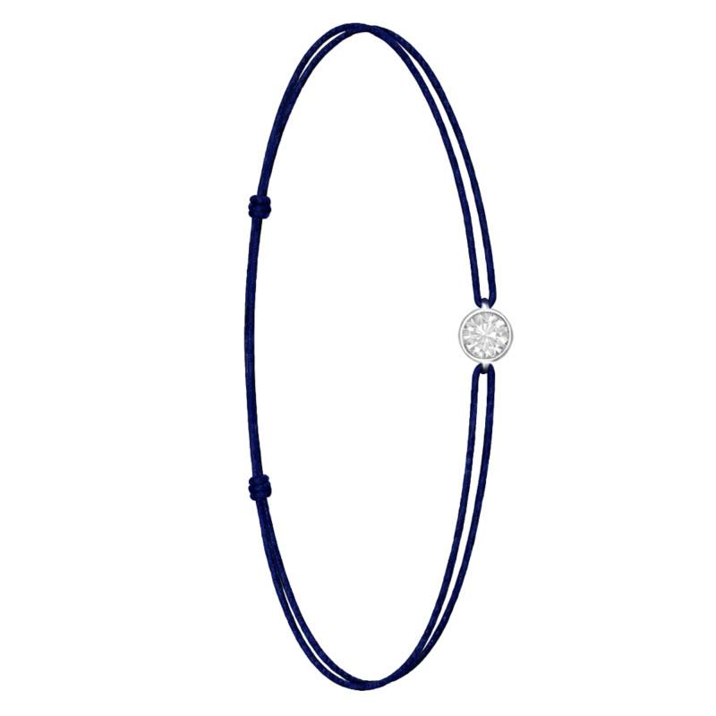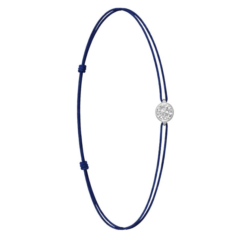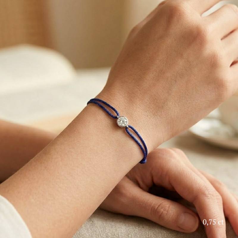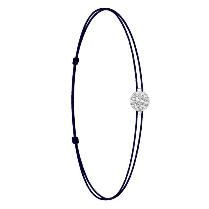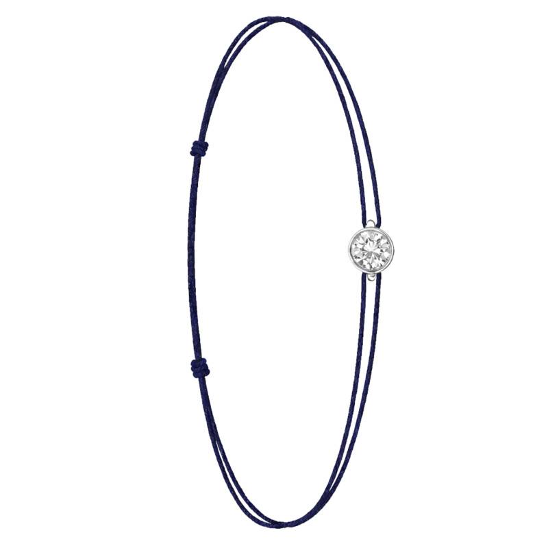 Le Bracelet Cordon Bleu Marine en Or Blanc 750 se distingue par son design épuré et sa touche de couleur vive. Il est orné d'un diamant de synthèse cultivé en laboratoire, disponible de 0,15 ct à 0,75 ct, serti clos dans de l'or blanc 750. De couleur D et de pureté VVS2, le diamant offre une excellente brillance et une grande pureté. Les bracelets de 0,15 ct à 0,25 carat mesurent 0,80 mm d'épaisseur et sont montés sur un cordon en nylon, à la fois fin et résistant. Les modèles de 0,30 ct à 0,75 carat présentent une épaisseur de 1 mm et sont dotés d'un cordon en satin, pour un rendu plus doux et élégant. Ajustable, ce bracelet s'adapte facilement à toutes les tailles de poignet.