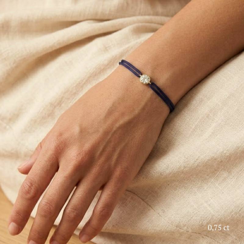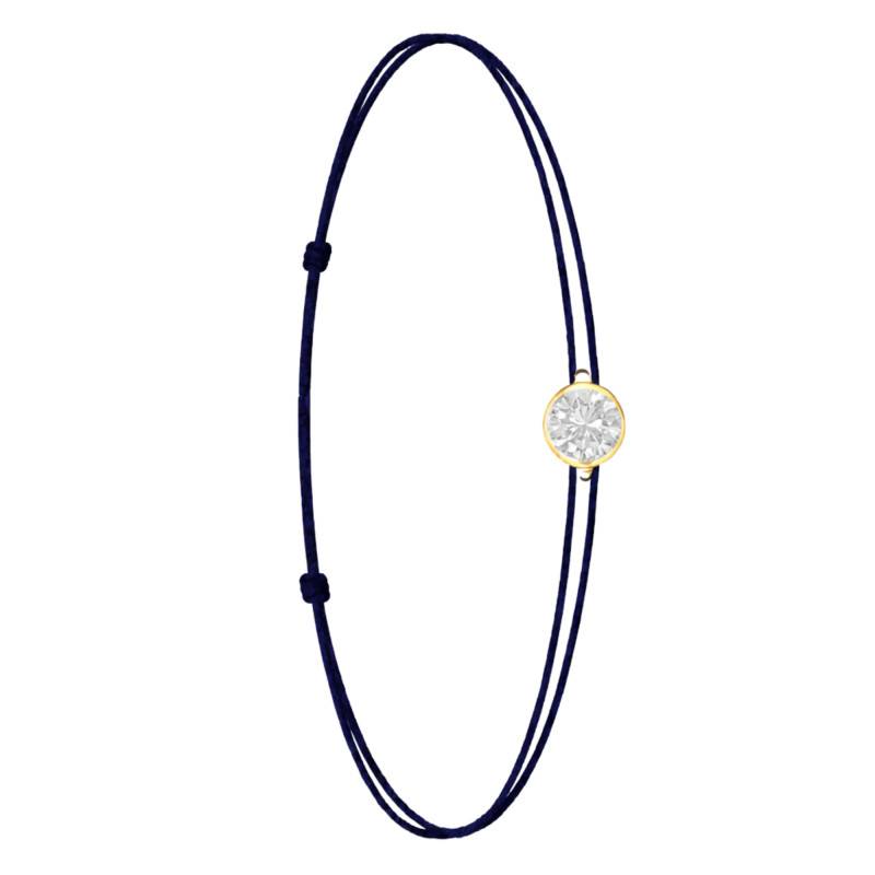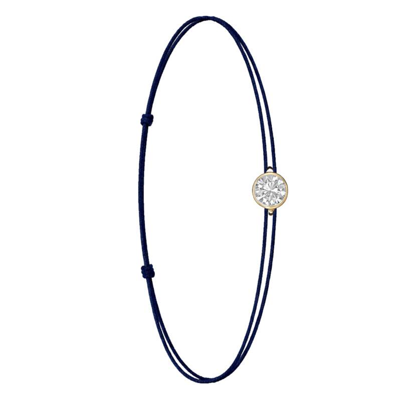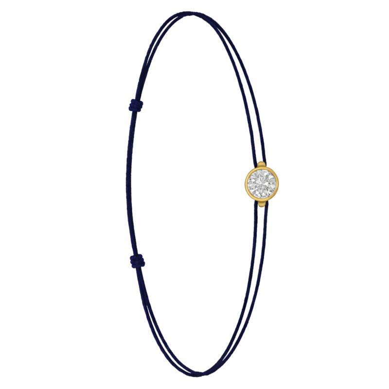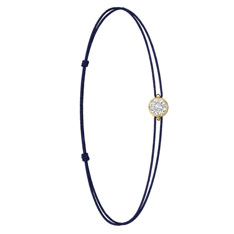 Le Bracelet Cordon Bleu Marine en Or Jaune 750 se distingue par son design épuré et sa touche de couleur vive. Il est orné d'un diamant de synthèse cultivé en laboratoire, disponible de 0,15 ct à 0,75 ct, serti clos dans de l'or jaune 750. De couleur D et de pureté VVS2, le diamant offre une excellente brillance et une grande pureté. Les bracelets de 0,15 ct à 0,25 carat mesurent 0,80 mm d'épaisseur et sont montés sur un cordon en nylon, à la fois fin et résistant. Les modèles de 0,30 ct à 0,75 carat présentent une épaisseur de 1 mm et sont dotés d'un cordon en satin, pour un rendu plus doux et élégant. Ajustable, ce bracelet s'adapte facilement à toutes les tailles de poignet.