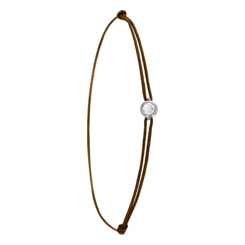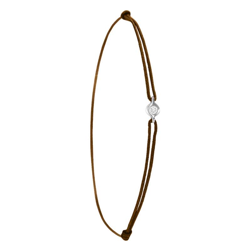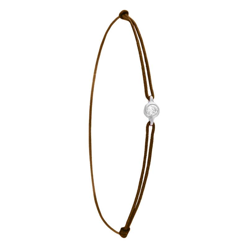 Ce bracelet dispose d'un diamant central disponible de 0,02 carat à 0.15 carat. D'un éclat fascinant, il est entouré par un anneau en or blanc 750/1000 (18K), ce qui crée une combinaison unique et charmante. Ils sont soutenus par un cordon de couleur marron que vous pourrez ajuster grâce à ses nœuds coulissants.