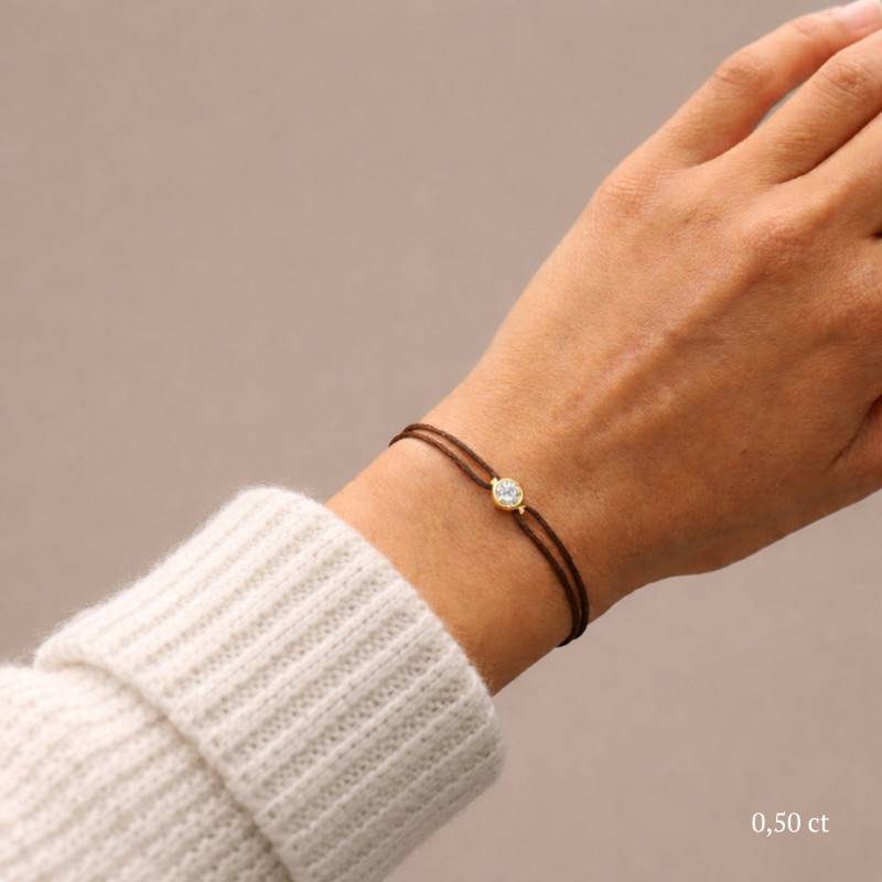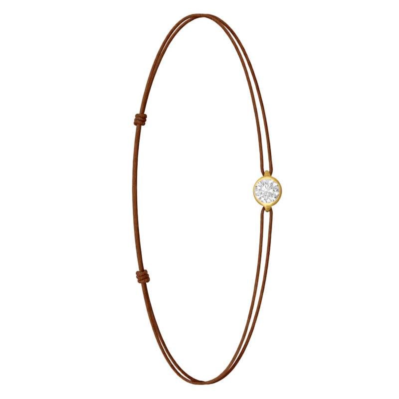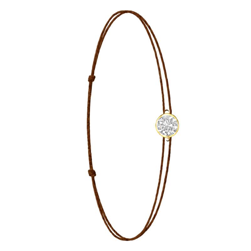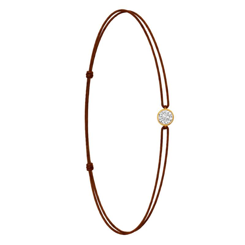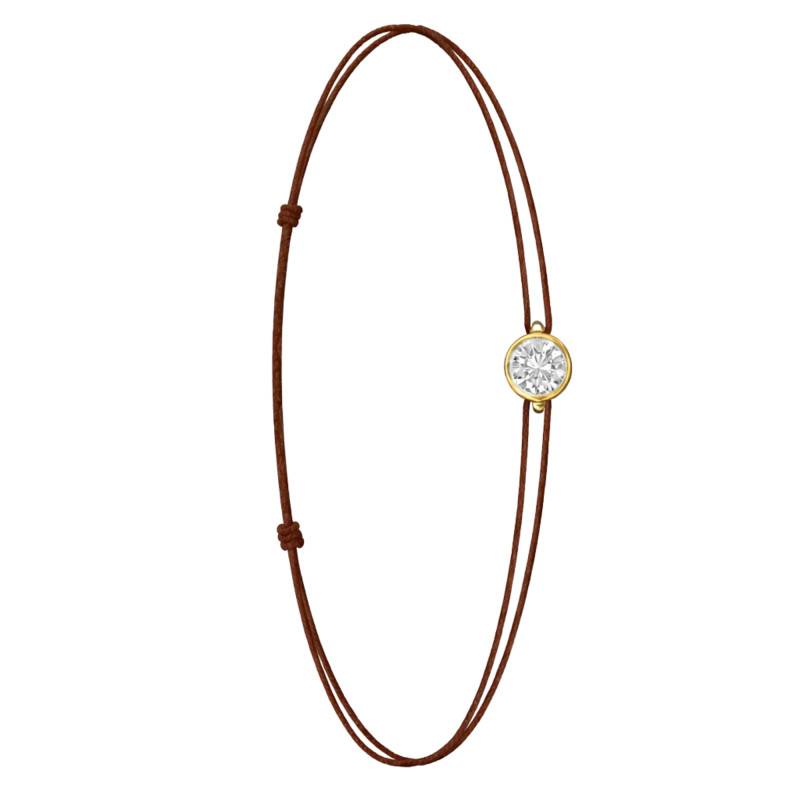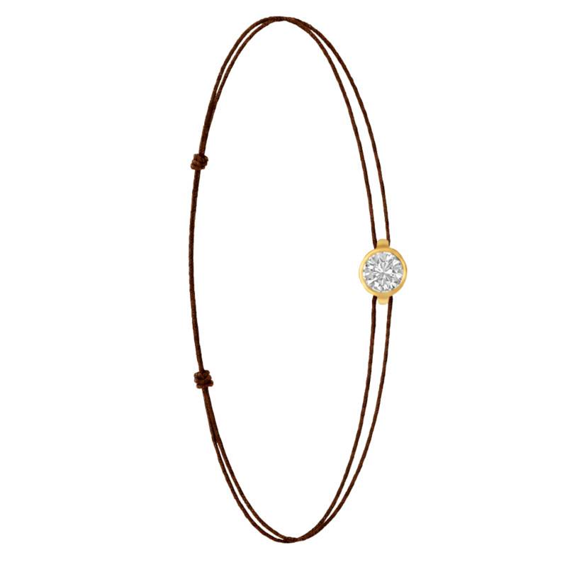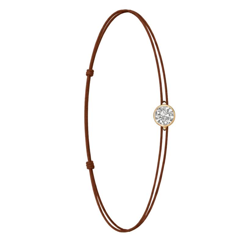 Le Bracelet Cordon Marron en Or Jaune 750 se distingue par son design épuré et sa touche de couleur. Il est orné d'un diamant de synthèse cultivé en laboratoire, disponible de 0,15 ct à 0,75 ct, serti clos dans de l'or jaune 750. De couleur D et de pureté VVS2, le diamant offre une excellente brillance et une grande pureté. Les bracelets de 0,15 ct à 0,25 carat mesurent 0,80 mm d'épaisseur et sont montés sur un cordon en nylon, à la fois fin et résistant. Les modèles de 0,30 ct à 0,75 carat présentent une épaisseur de 1 mm et sont dotés d'un cordon en satin, pour un rendu plus doux et élégant. Ajustable, ce bracelet s'adapte facilement à toutes les tailles de poignet. Enfin, Le poids du bracelet varie selon le carat choisi, allant de 0,25 g à 0,65 g.