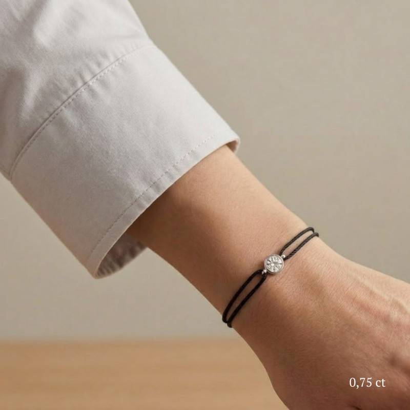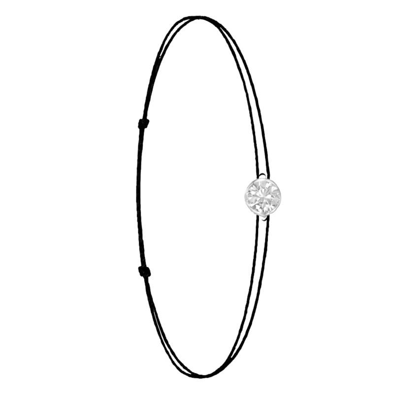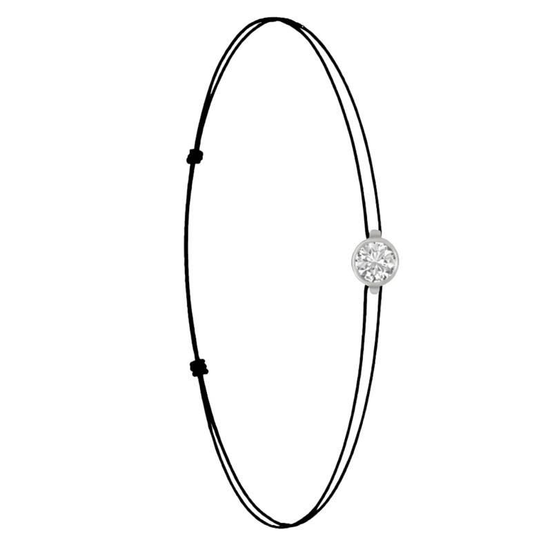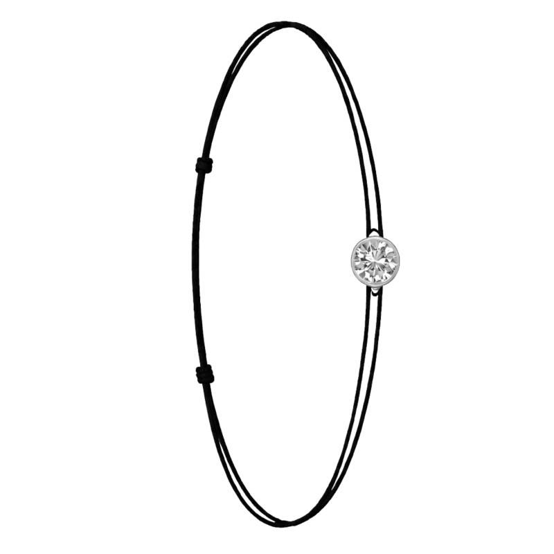 Le Bracelet Cordon Noir en Or Blanc 750 se distingue par son design épuré et sa couleur vive. Il est orné d'un diamant de synthèse cultivé en laboratoire, disponible de 0,15 ct à 0,75 ct, serti clos dans de l'or blanc 750. De couleur D et de pureté VVS2, le diamant offre une excellente brillance et une grande pureté. Les bracelets de 0,15 ct à 0,25 carat mesurent 0,80 mm d'épaisseur et sont montés sur un cordon en nylon, à la fois fin et résistant. Les modèles de 0,30 ct à 0,75 carat présentent une épaisseur de 1 mm et sont dotés d'un cordon en satin, pour un rendu plus doux et élégant. Ajustable, ce bracelet s'adapte facilement à toutes les tailles de poignet.