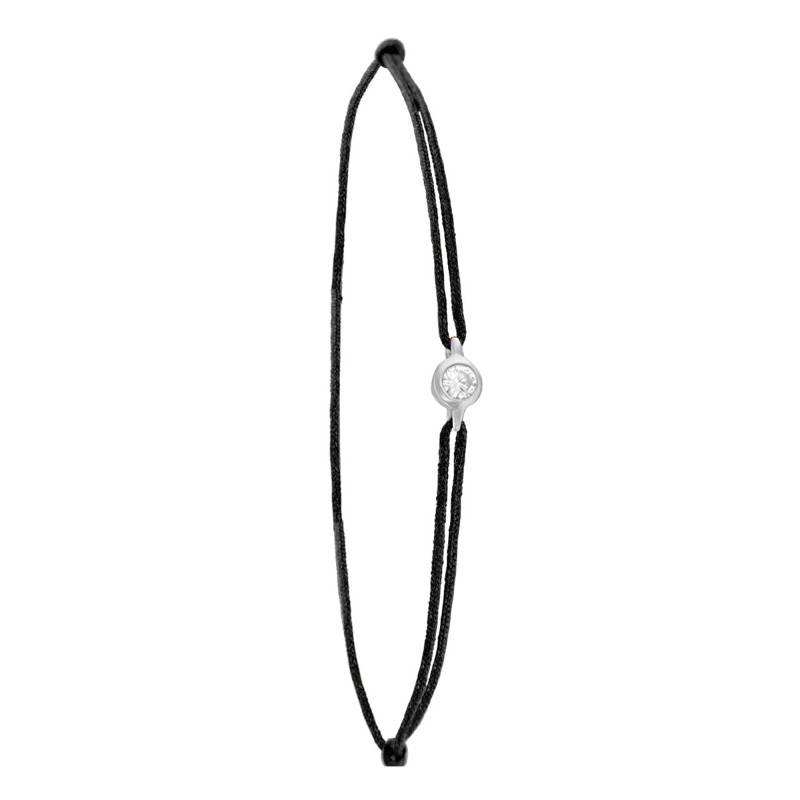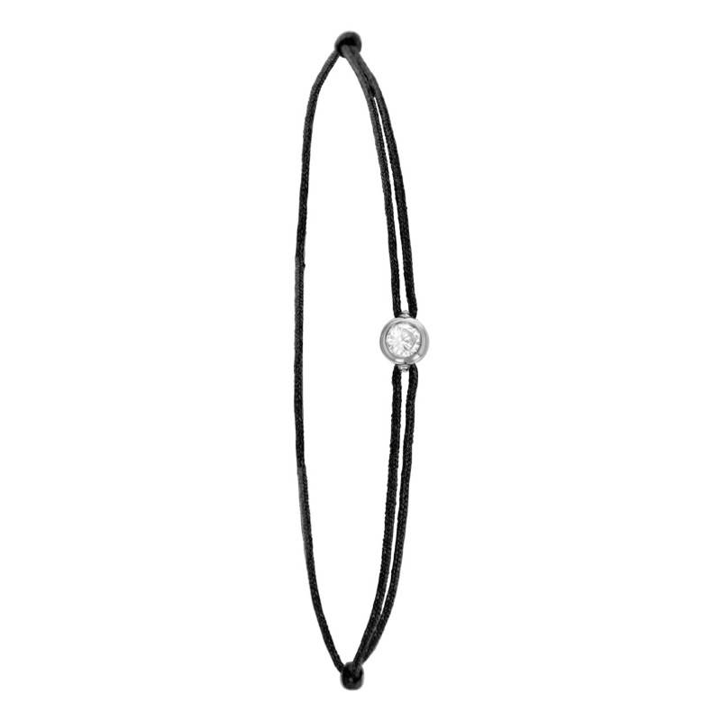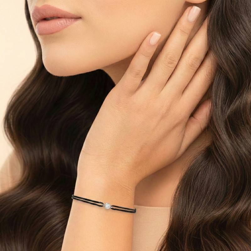 Ce bracelet a tous les atouts pour devenir un cadeau à offrir ou à se faire offrir. Il est fait en cordon de couleur noire et dispose d'une pierre en diamant HSI de forme ronde disponible de 0,02 carat à 0,15 carat. Elle est sertie sur une monture en or 750/1000 (18K) d'une teinte blanche. Son éclat somptueux marquera votre identité et en dira beaucoup sur vous. Vous pourrez l'ajuster à l'aide des nœuds coulissants.