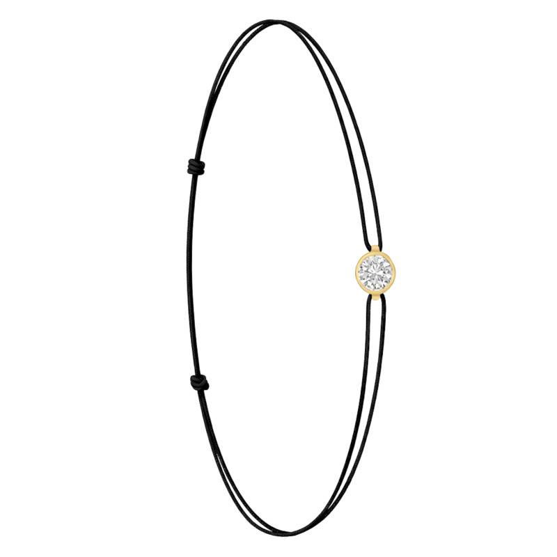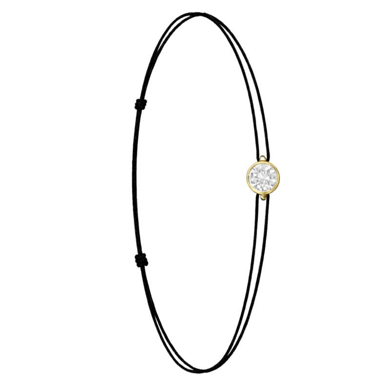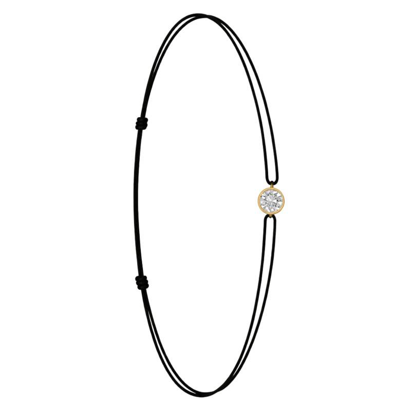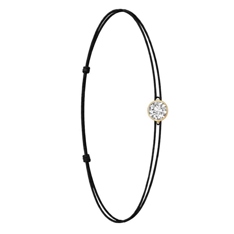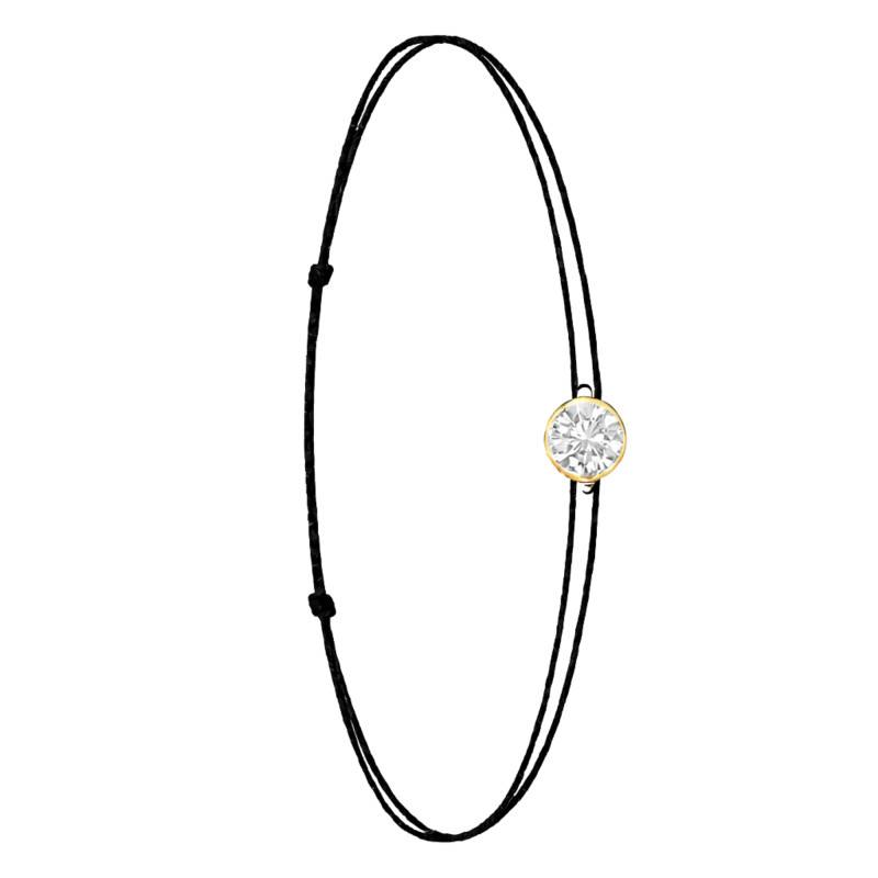 Le Bracelet Cordon Noir en Or Jaune 750 se distingue par son design épuré et sa couleur vive. Il est orné d'un diamant de synthèse cultivé en laboratoire, disponible de 0,15 ct à 0,75 ct, serti clos dans de l'or jaune 750. De couleur D et de pureté VVS2, le diamant offre une excellente brillance et une grande pureté. Les bracelets de 0,15 ct à 0,25 carat mesurent 0,80 mm d'épaisseur et sont montés sur un cordon en nylon, à la fois fin et résistant. Les modèles de 0,30 ct à 0,75 carat présentent une épaisseur de 1 mm et sont dotés d'un cordon en satin, pour un rendu plus doux et élégant. Ajustable, ce bracelet s'adapte facilement à toutes les tailles de poignet.