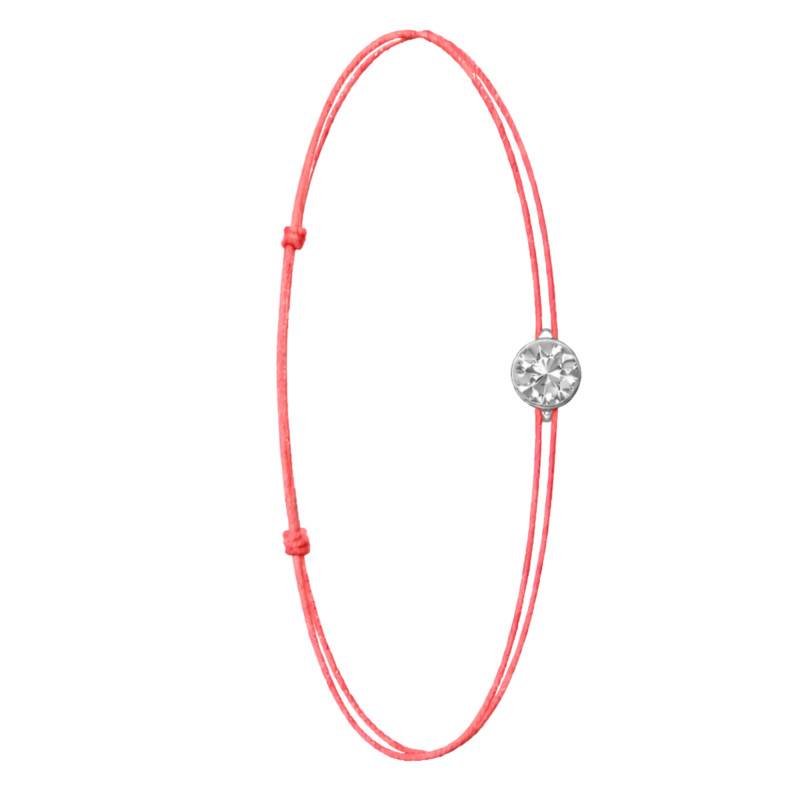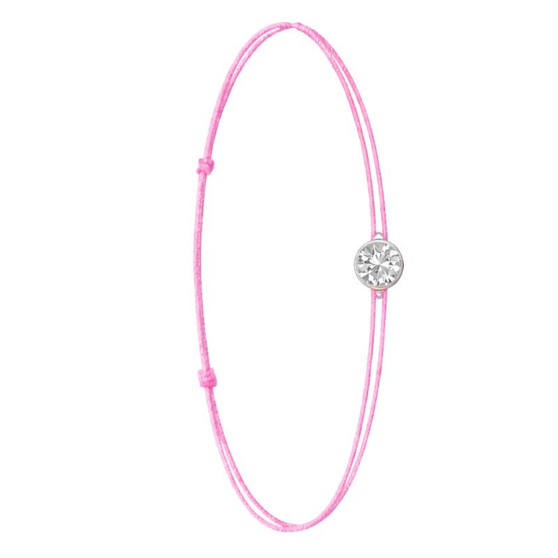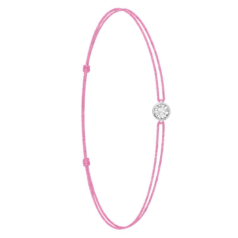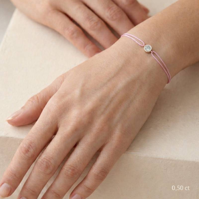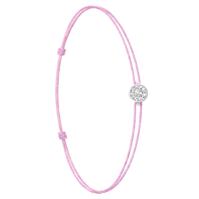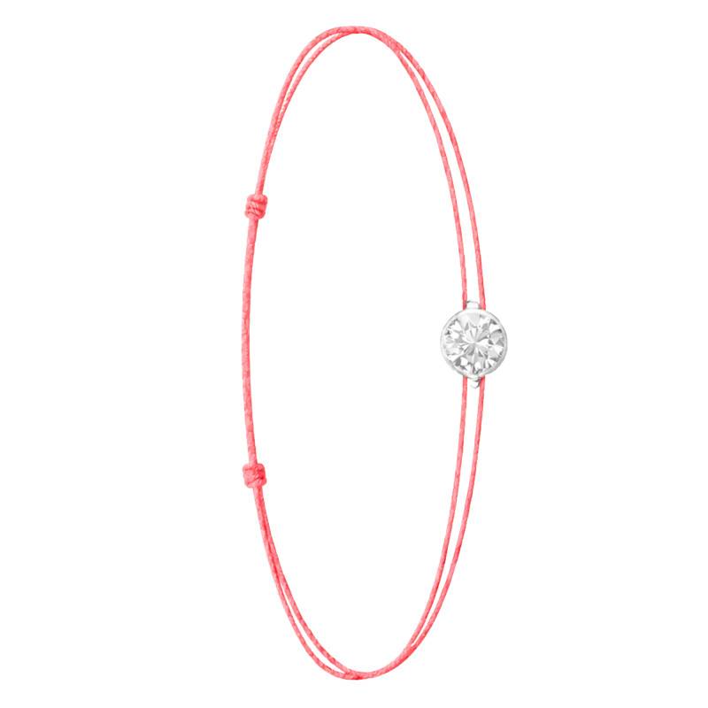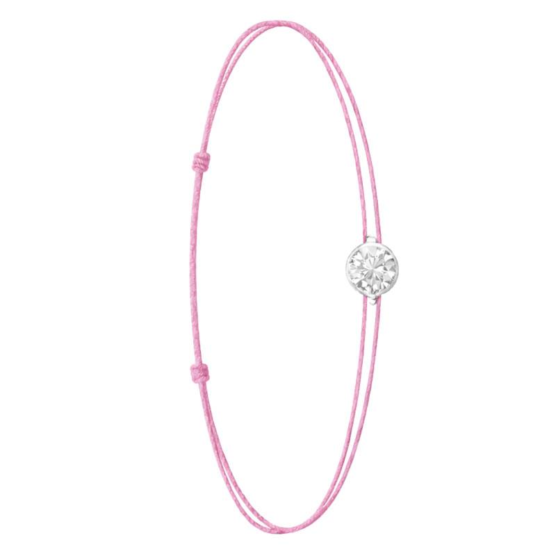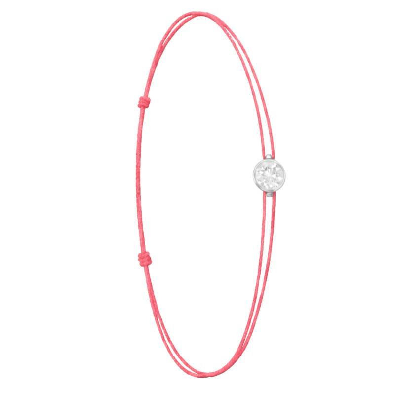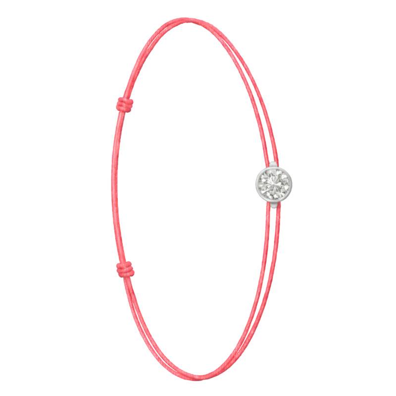 Le Bracelet Cordon Rose en Or Blanc 750 se distingue par son design épuré et sa touche de couleur vive. Il est orné d'un diamant de synthèse cultivé en laboratoire, disponible de 0,15 ct à 0,75 ct, serti clos dans de l'or blanc 750. De couleur D et de pureté VVS2, le diamant offre une excellente brillance et une grande pureté. Les bracelets de 0,15 ct à 0,25 carat mesurent 0,80 mm d'épaisseur et sont montés sur un cordon en nylon, à la fois fin et résistant. Les modèles de 0,30 ct à 0,75 carat présentent une épaisseur de 1 mm et sont dotés d'un cordon en satin, pour un rendu plus doux et élégant. Ajustable, ce bracelet s'adapte facilement à toutes les tailles de poignet.