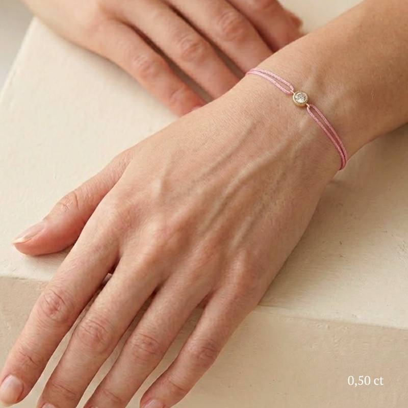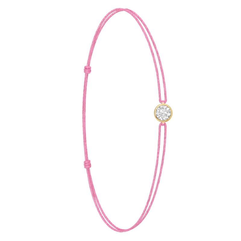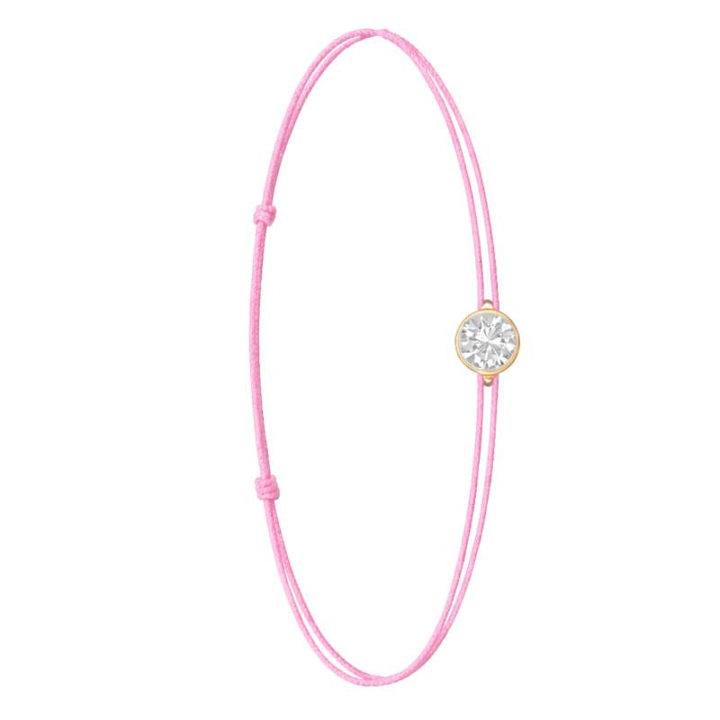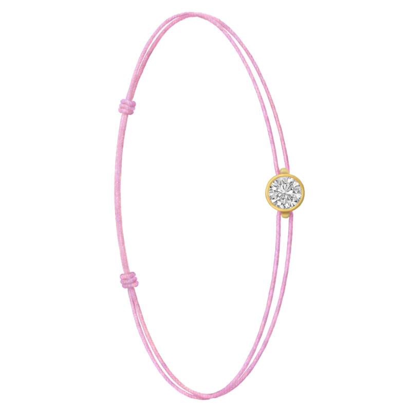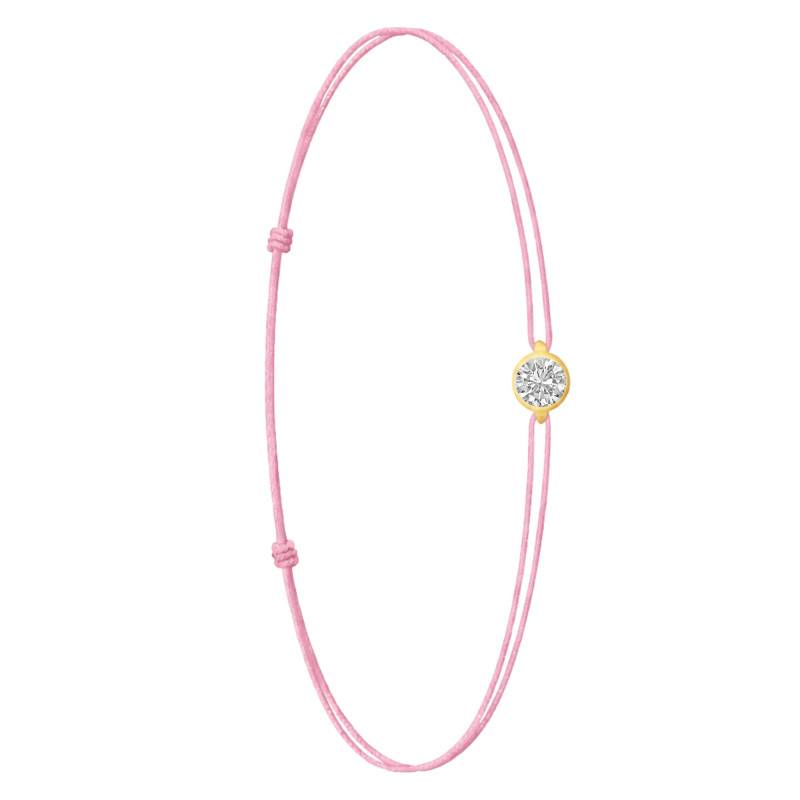 Le Bracelet Cordon Rose en Or Jaune 750 se distingue par son design épuré et sa touche de couleur vive. Il est orné d'un diamant de synthèse cultivé en laboratoire, disponible de 0,15 ct à 0,75 ct, serti clos dans de l'or jaune 750. De couleur D et de pureté VVS2, le diamant offre une excellente brillance et une grande pureté. Les bracelets de 0,15 ct à 0,25 carat mesurent 0,80 mm d'épaisseur et sont montés sur un cordon en nylon, à la fois fin et résistant. Les modèles de 0,30 ct à 0,75 carat présentent une épaisseur de 1 mm et sont dotés d'un cordon en satin, pour un rendu plus doux et élégant. Ajustable, ce bracelet s'adapte facilement à toutes les tailles de poignet.