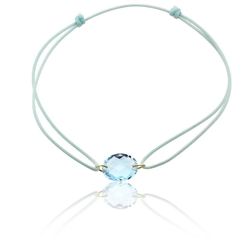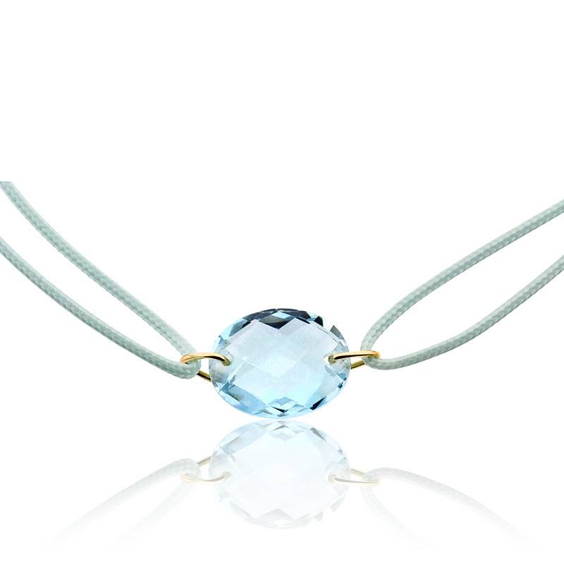Ravissant bracelet à cordon coulissant bleu pâle. Une topaze bleue taille ovale (10x8 mm) apporte tout l'éclat de sa couleur au centre du bracelet. Deux anneaux en or jaune 750/1000 (18K) font tenir la topaze à ses extrémités sur le cordon coulissant.