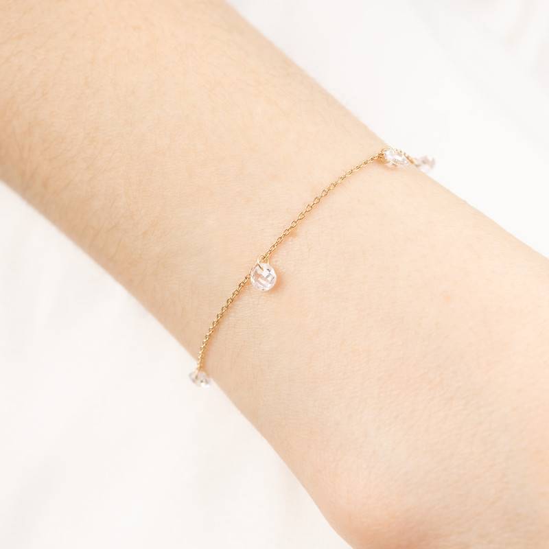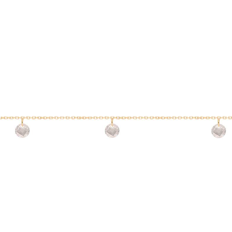 Parmi les bijoux attrayants de la marque, nous vous proposons ce ravissant bracelet en or jaune 375/1000 (9K). Il est composé d'une belle et délicate chaîne de 18,5 cm de longueur, ajustable grâce à une chaînette d'extension. Cet élégant bracelet est décoré de 7 cristaux ronds blancs qui reflètent un éclat scintillant et qui apporteront la touche finale à votre look. Ces derniers disposent d'un diamètre de 4 mm et d'une épaisseur de 2,08 mm. Ce bijou présente un poids d'or moyen de 1,20 gramme et se termine par un anneau à ressort qui assure un bon maintien. Notez que les cristaux ne seront pas alignés une fois porté mais s'harmoniseront parfaitement et gracieusement autour de votre poignet.