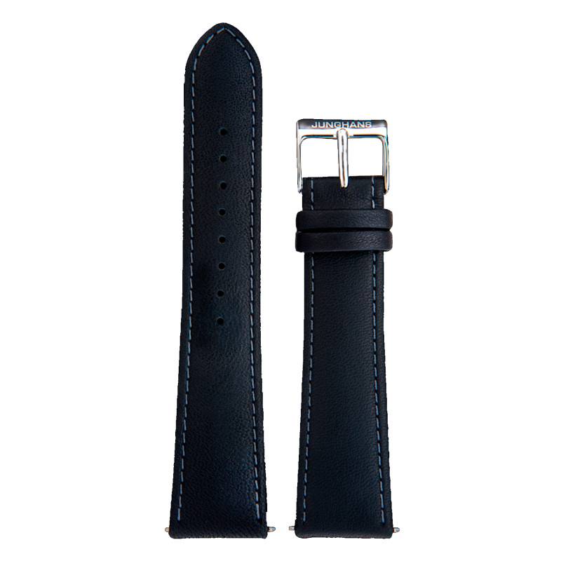 Ce bracelet Junghans en cuir de bovin noir présente une largeur de 21 mm. Il est compatible avec toutes les montres Junghans disposant d'une entrecorne de 21 mm. Habillée de fines surpiqures, il est équipée d'une boucle ardillon en acier siglée Junghans de 18 mm de large. Il mesure 7.5 cm pour la partie à boucle et 12 cm pour la partie à trous.