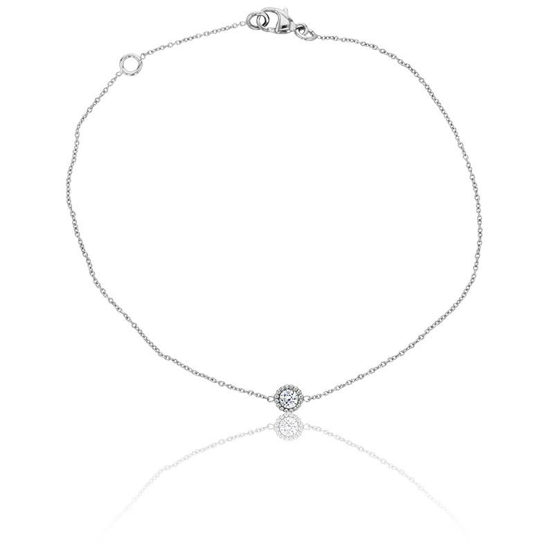 Ce bracelet est composé d'un diamant serti clos de 0,08 ct entouré par une finition perlée, qui donne tout son éclat au bijou. Le motif central a un diamètre de 4 mm.
