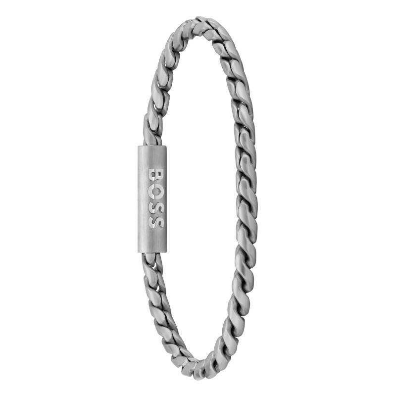 Avec sa teinte argentée, ce bracelet est doté d'une chaîne en maille gourmette tissée qui lui donne un aspect original. Il est constitué d'acier inoxydable et se ferme grâce à un fermoir magnétique facile à manipuler et portant la signature Boss. Ce bijou de la collection Doran est sublimé par une finition polie qui le rend encore plus attractif. Son poids est de 21 grammes et sa longueur est ajustable de 18 à 19 cm.