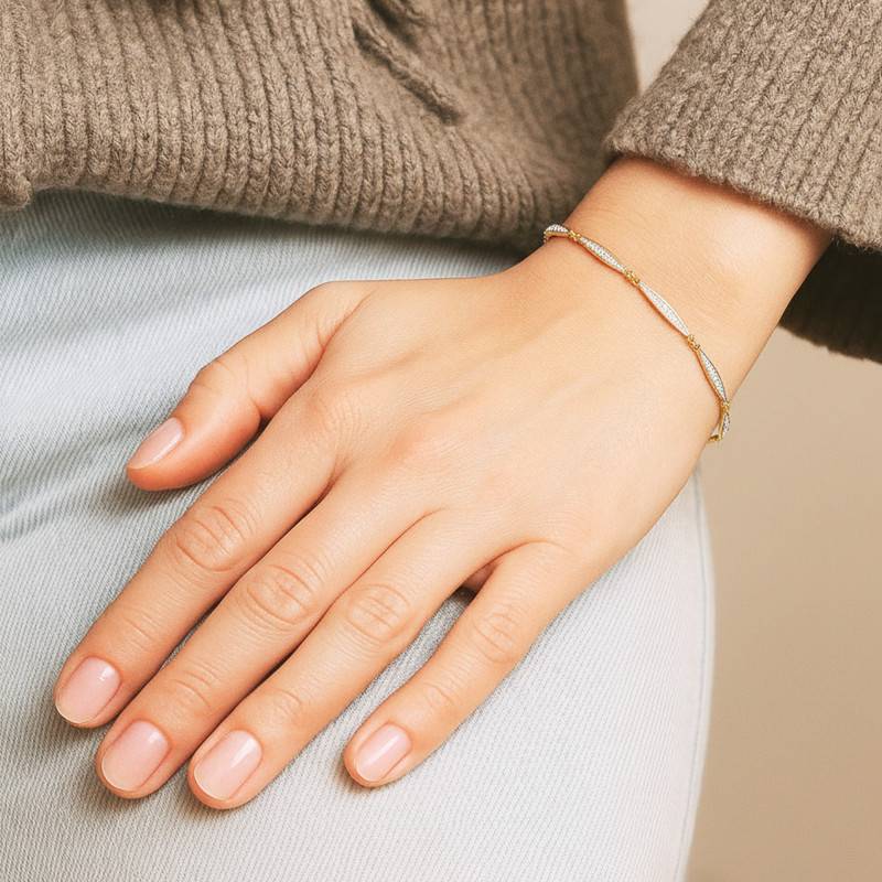 Ce bracelet en argent 925 plaqué d'un somptueux or jaune est orné de 9 étincelants diamants de synthèse cultivés en laboratoire d'un poids total de 0,04 ct. La finesse de son serti clos sublime la blancheur des pierres, jouant avec la lumière. Conçu pour épouser délicatement le poignet, ce bijou aux dimensions précises, d'une longueur de 19 cm et d'un poids total de 2,60 g, arbore un fermoir mousqueton sécurisé. La finition polie et brillante ajoute une touche finale d'éclat à cette pièce déjà magnifique.
