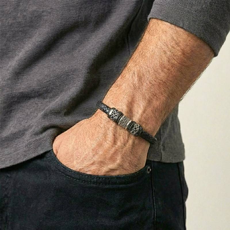 Explorez la parfaite alchimie entre force et sophistication avec ce bracelet en cuir de bovin noir tressé. Son design est agrémenté de trois motifs en acier inoxydable, évoquant des histoires audacieuses à chaque nuance argentée. Avec une longueur de 21 cm, chaque centimètre enveloppe votre poignet d'une élégance brute, tandis que son poids d'environ 17,50 g vous rappellent la qualité inégalée de cet accessoire incontournable.