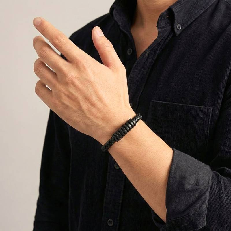 Le Bracelet en Cuir de Bovin Tressé Motif Spirale déploie un charme envoûtant qui évoque à la fois tradition et modernité. Conçu pour l'homme d'aujourd'hui, ce bracelet arbore une longueur de 21 cm, idéalement adapté pour épouser votre poignet. Sa texture en cuir de bovin et son fermoir en acier inoxydable capturent la lumière avec une sophistication discrète. Le noir profond enveloppe ce bijou d'une aura mystérieuse, tandis que le motif spirale symbolise l'infini et l'unité. Ce bracelet pèse 21 g et est accompagné d'une garantie de 2 ans.