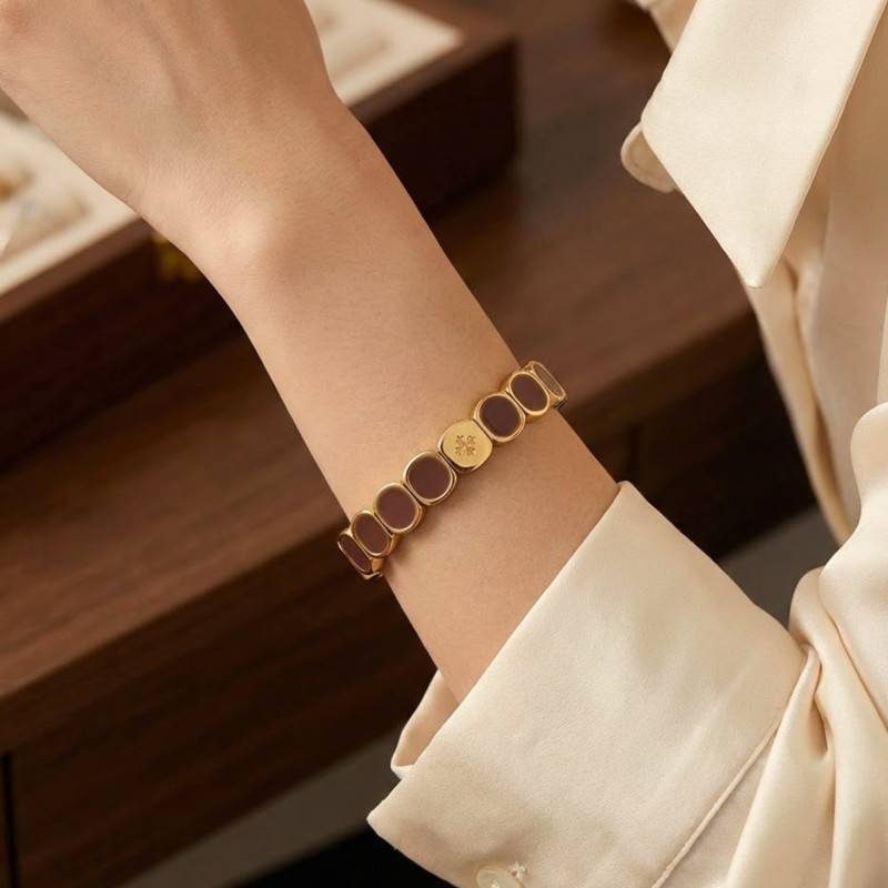 Découvrez la somptuosité de ce bracelet en métal et émail marron chocolat. Ce bijou est une ode à la féminité, se parant de marron chocolat profond et de nuances envoûtantes de jaune doré. Conçu en métaux divers de haute qualité, il offre une finition polie et brillante qui capte la lumière avec une grâce infinie. Sa longueur de 19,50 cm est idéale pour embrasser délicatement le poignet, tandis que chaque détail, du métal précieux à l'émail éclatant, s'entrelace pour former un ensemble harmonieux.