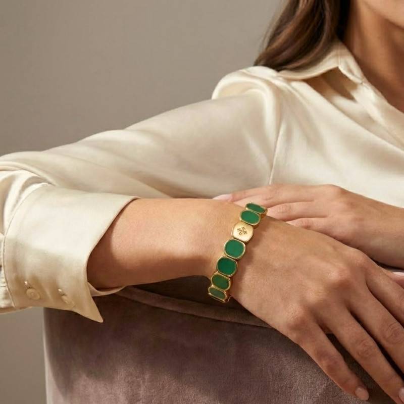 Découvrez la somptuosité de ce bracelet en métal et émail vert. Ce bijou est une ode à la féminité, se parant de vert profond et de nuances envoûtantes de jaune doré. Conçu en métaux divers de haute qualité, il offre une finition polie et brillante qui capte la lumière avec une grâce infinie. Sa longueur de 19,50 cm est idéale pour embrasser délicatement le poignet, tandis que chaque détail, du métal précieux à l'émail éclatant, s'entrelace pour former un ensemble harmonieux.