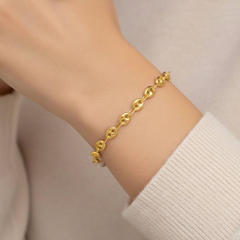 Découvrez le Bracelet Grain de Café en Or jaune 375, conçu pour sublimer votre poignet avec sa maille Grain de café éclatante. Ce bijou, d'une longueur de 18 cm, est façonné en Or Jaune 375/1000 (9K), garantissant une brillance durable et un éclat sans pareil. Avec une épaisseur de 4 mm et un poids de 2,30 g, il incarne la grâce et la légèreté, tandis que le fermoir mousqueton assure une sécurité optimale. La finition polie et brillante ajoute une touche de luxueuse sophistication à cet accessoire précieux.