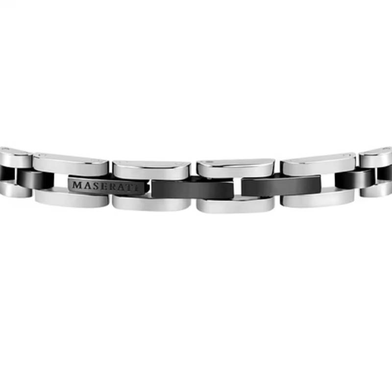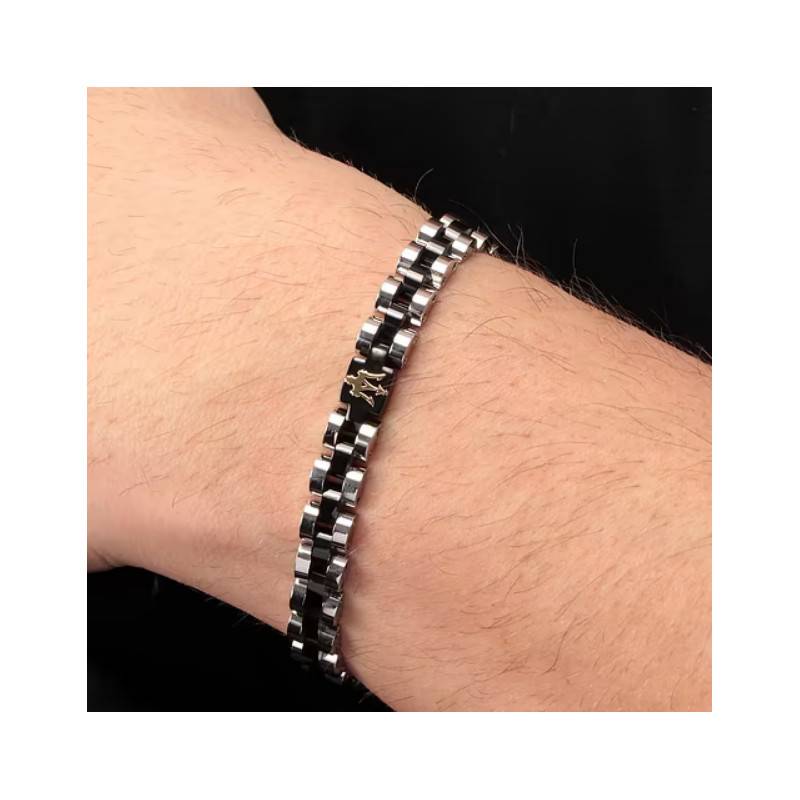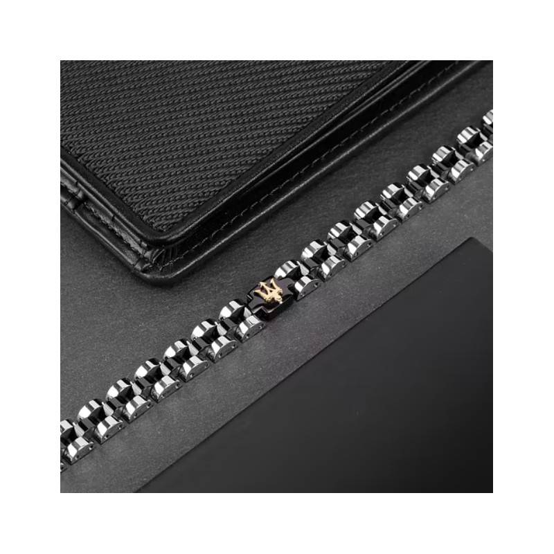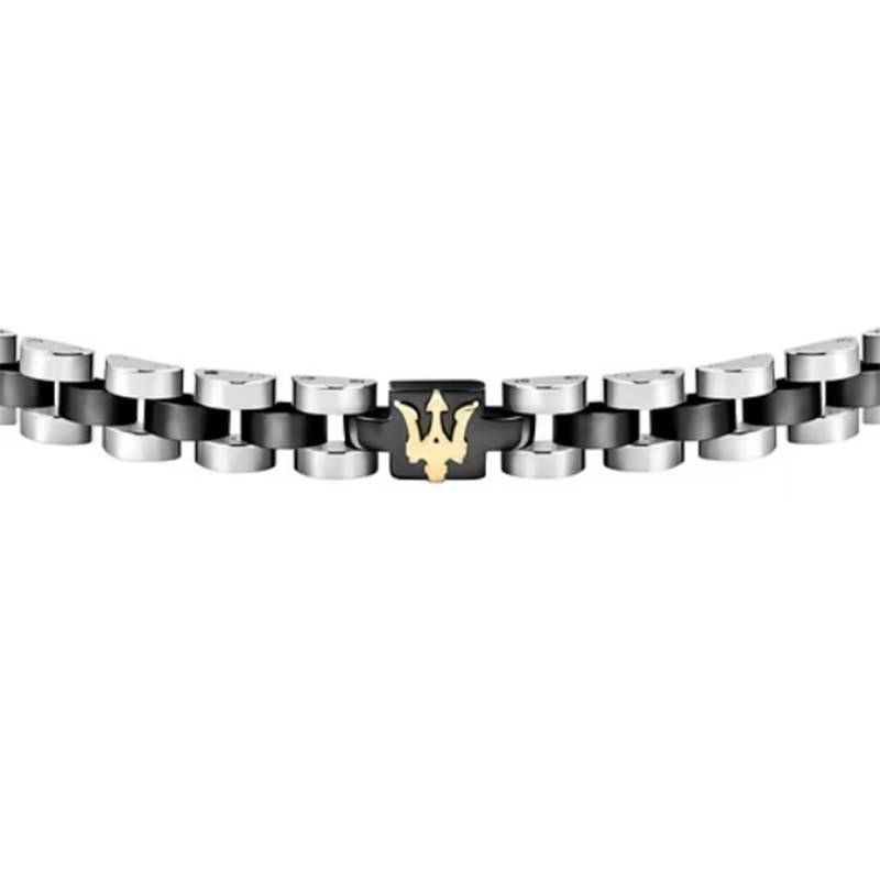 Le Bracelet Iconic en Acier Gris et Noir se distingue par une subtile harmonie entre ombre et lumière. Sa surface en acier poli et brillant dégage une allure moderne et intemporelle. Mesurant entre 20 et 21,50 cm de longueur pour une largeur de 7 mm, il s'adapte avec élégance à chaque poignet masculin. Son fermoir à boucle déployante assure un maintien sûr tout en soulignant la finesse de son design. Orné du symbole distinctif de Maserati, ce bracelet capture l'essence du raffinement et du style à l'italienne.
