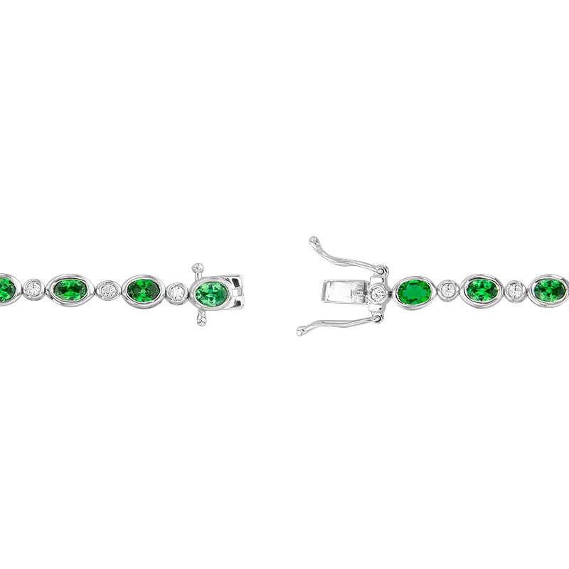 Ravissant bracelet en or blanc rhodié 750/1000 (18K) composé de vingt-deux émeraudes de 4x3 mm taillées en ovale et serties clos et de vingt-deux diamants taillés en brillant et sertis clos également. Une pierre est alternée avec un diamant à chaque fois.