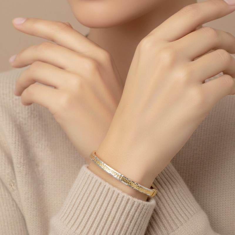 Découvrez le Bracelet Jonc Diamantée en 2 Ors 375, une symphonie de lumière et de textures. Ce jonc pour femme se pare de la sensualité de l'or jaune et de la pureté de l'or blanc, tous deux en or 375/1000 (9K). La finition diamantée reflète chaque rayonnement, sublimant la lumière avec une grâce inégalée. Ce trésor a une largeur de 3,90 mm à 60,00 mm et une hauteur de 53,00 mm, pour un poids de 4,70 g. Ce bijou, qui évoque la rencontre entre deux univers somptueux, est une déclaration de goût et de distinction.