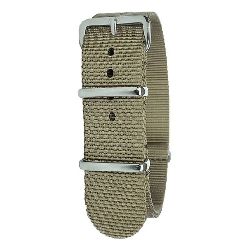 Enfin, ce bracelet NATO se teinte d'une couleur kaki army (un vert qui tire tout de même sur une couleur "sable"), pour un style discret à la limite du camouflage. Vous noterez que l'entre-corne de ce modèle s'élève à 20 millimètres.