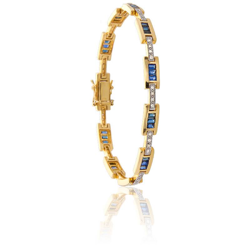 Elégant bracelet en or jaune 750/1000 (18K) composé de saphirs sertis rails et de diamants sertis à grains de façon alternée. Les diamants ont un poids total de 0,26 carat, une couleur H et une pureté SI1. Le bracelet a une longueur de 18,50 cm.