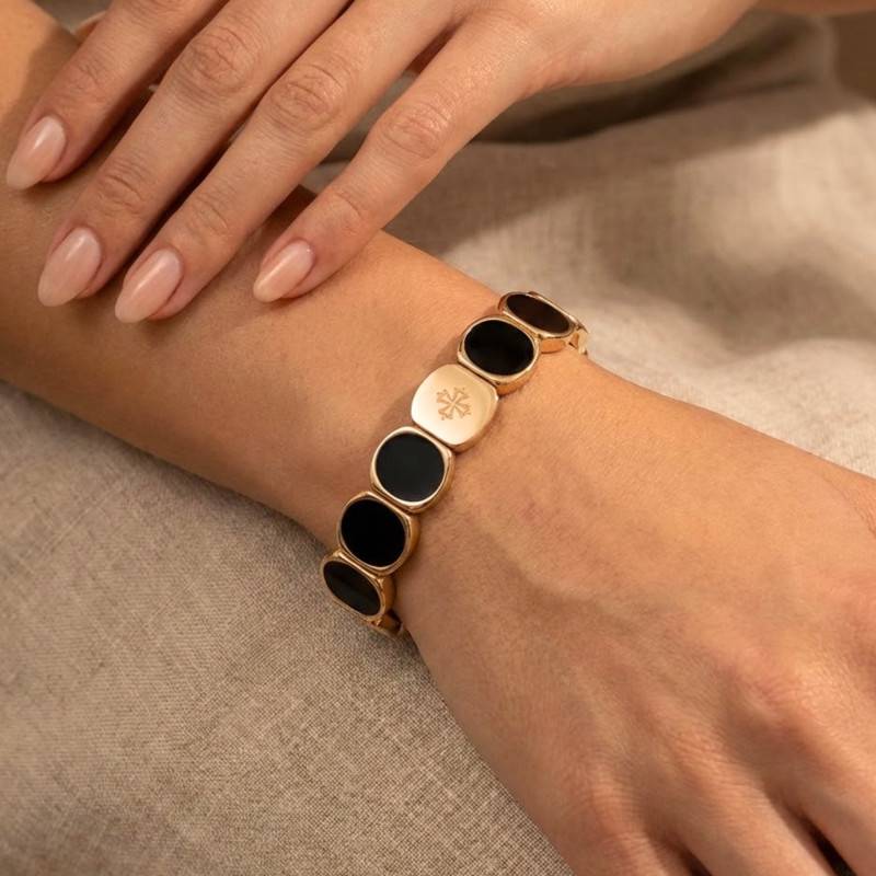 Le bracelet large en métal & émail noir, d'une longueur de 19,50 cm, est une ode à la féminité. Sa finition polie et brillante, où se reflète la lumière, évoque les doux rayons du soleil. La couleur noire immaculée contraste magnifiquement avec le doré du métal, créant une harmonie visuelle captivante. Ce bijou, orné d'un délicat motif en son centre, est conçu pour sublimer votre poignet avec raffinement. Ce bracelet incarne l'équilibre parfait entre robustesse et délicatesse grâce à l'utilisation de métaux divers et de l'émail de haute qualité.