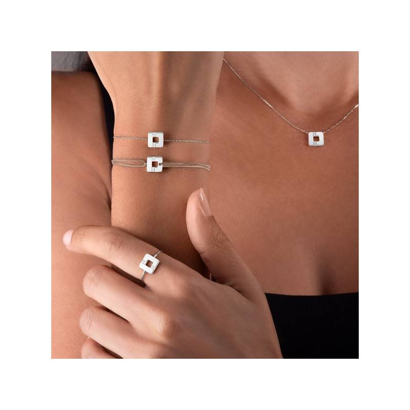 Faisant partie de la collection Arty, une ligne qui met en exergue un design Skalli emblématique des années 90, ce joli bracelet Ligne Arty Carré Ajouré saura vous séduire par la finesse de ses lignes et par la qualité de sa fabrication. Conçu à la main par des artisans dévoués et perfectionnistes, il saura vous parer avec élégance. En nylon, son cordon noir soulignera les courbes de votre poignet avec délicatesse en accordant à votre allure une note de sobriété raffinée. Il met en avant un carré ajouré en or blanc 750/1000 (18K). D'un poids d'or moyen de 1,30 gramme, ce dernier fait 8 x 8 mm de dimensions et s'embellit de quatre diamants de 0,023 carat. Taillées rondes, les pierres apportent à l'ensemble un air luxueux et doux par leur couleur blanche et sauront accorder à votre poignet l'éclat parfait qui subjuguera tous les regards. Ce bracelet est réglable et se ferme avec souplesse à l'aide de ses deux nœuds coulissants.