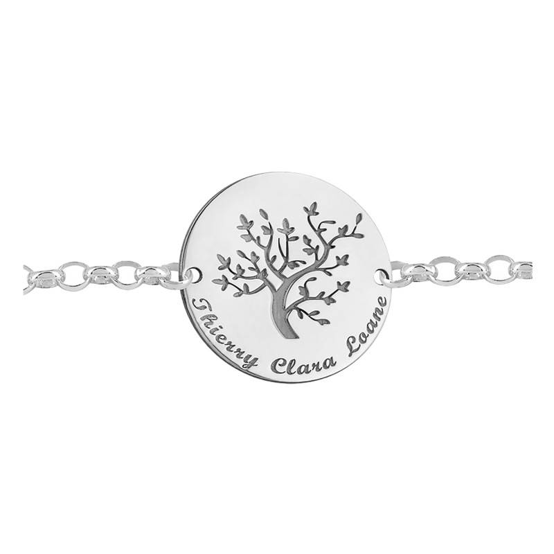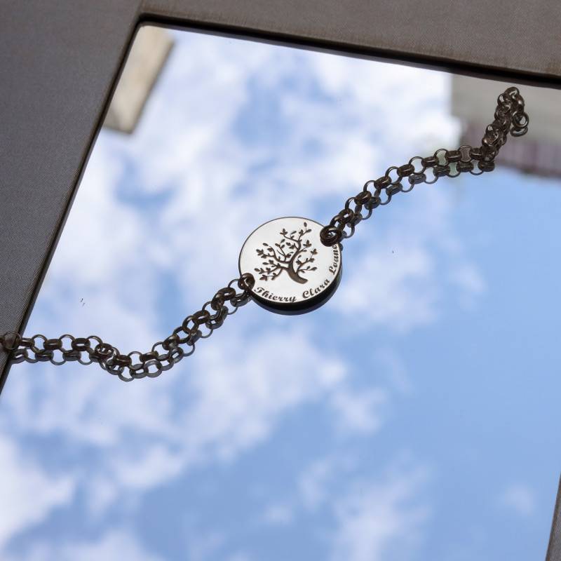 Ce bracelet en or blanc est composé d'une maille forçat, ainsi que d'un arbre de vie gravable jusqu'à trois prénoms. Grâce au menu déroulant, vous pourrez non seulement choisir son caratage, mais aussi les inscriptions qu'il portera !
