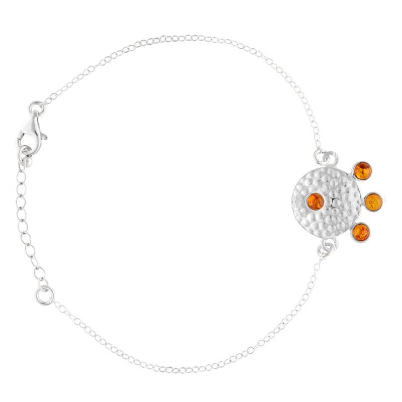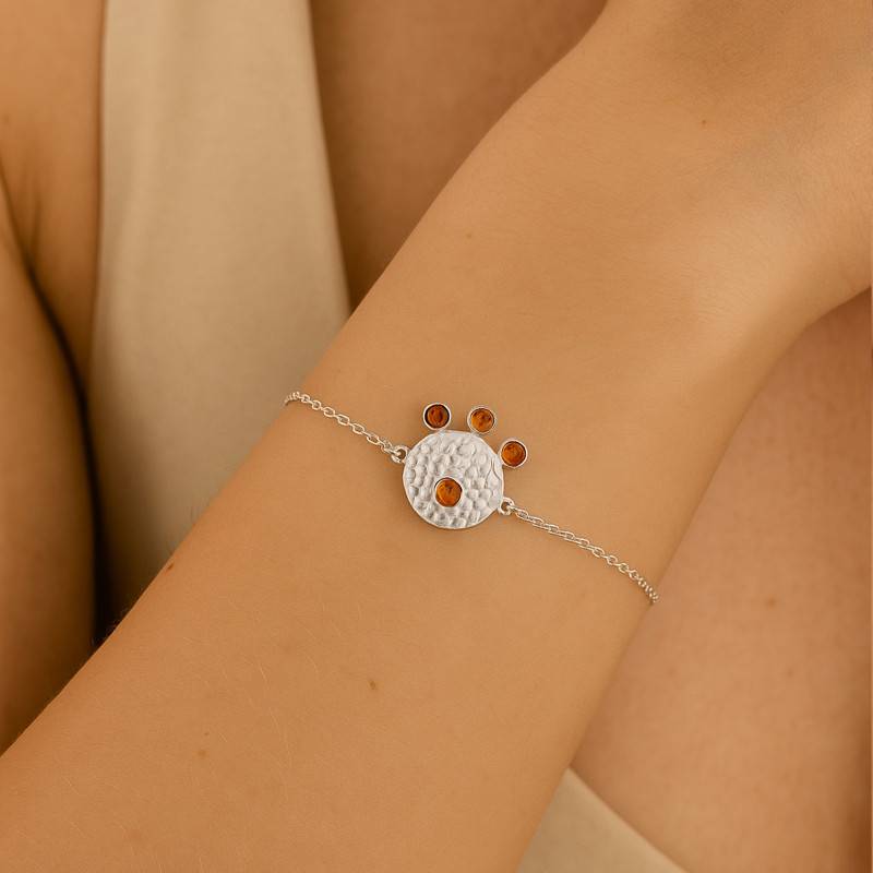 Le Bracelet Médaille Martelée en Argent 925 & Ambre allie modernité et tradition. Réalisé en argent massif 925/1000, il présente une surface martelée à la finition polie et brillante. Sa médaille martelée est d'une épaisseur de 0,5 mm. Ses quatre pierres d'ambre apportent une touche lumineuse et chaleureuse. Grâce à sa longueur ajustable de 16 à 18 cm et à son poids léger de 2,60 g, il offre un confort optimal tout en sublimant le poignet. Le fermoir mousqueton garantit un maintien sûr et discret.