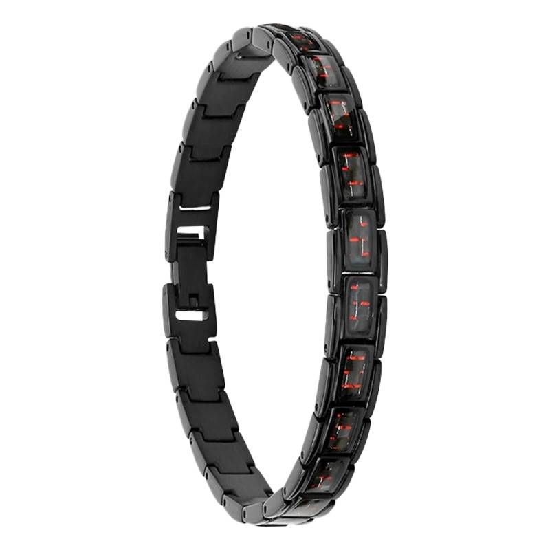 Ce magnifique bracelet Mercury vous parera avec une élégance audacieuse et vous ajoutera un charme très masculin. Il est conçu en acier inoxydable et traité de PVD noir ce qui lui accorde cette teinte noire très profonde. Il se compose d'une suite de maillons rectangulaires en Y avec des parties centrales brillantes rehaussées par du carbone fil rouge. Ce bracelet affiche une largeur de 8 mm et une longueur ajustable de 21 cm et intègre un fermoir clipable.