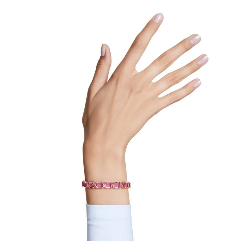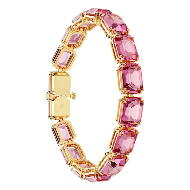 Faisant partie de la collection Millenia, ce fascinant bracelet au charme irrésistible saura vous éblouir une fois acquis en apportant à chacune de vos tenues une touche de féminité et de douceur captivante. Il ne ratera aucune occasion pour vous embellir en tenant toujours sa promesse de vous faire resplendir. Ce bijou est fabriqué en métal avec un revêtement doré qui rehausse sa beauté. Il se pare d'une finition polie pour un bel effet au poignet et arbore une rangée délicate de cristaux roses taillés dans une forme octogonale et sertis à huit griffes dans des montures de la même taille. Ce bracelet saura s'accorder à la perfection avec tous vos looks en vous conférant une allure élégante. Il mesure 8 mm de largeur et 17 cm de longueur que vous pourrez ajuster jusqu'à 19 cm grâce à son système d'extension dissimulé composé d'un fermoir à boutons poussoirs. Ce dernier vous permettra d'enfiler votre bijou avec aisance sans risque de l'égarer.