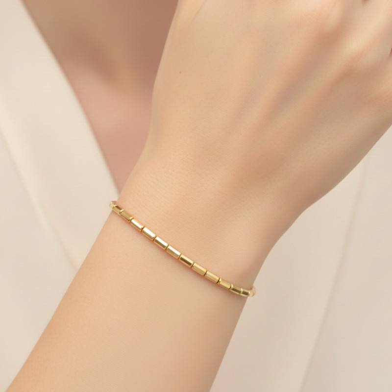 Laissez-vous envoûter par le Bracelet Mini Barres Taillées en Or Jaune 375, une merveille de 19 cm de longueur qui évoque à chaque reflet la chaleur douce de l'or pur. Ses délicates barres alignées en une danse harmonieuse captivent le regard par leur éclat poli et brillant, tandis que la sécurité est assurée par un fermoir mousqueton. Ce bijou, en or jaune 375/1000 (9K), dévoile toute sa splendeur avec un poids total de 2,70 g.