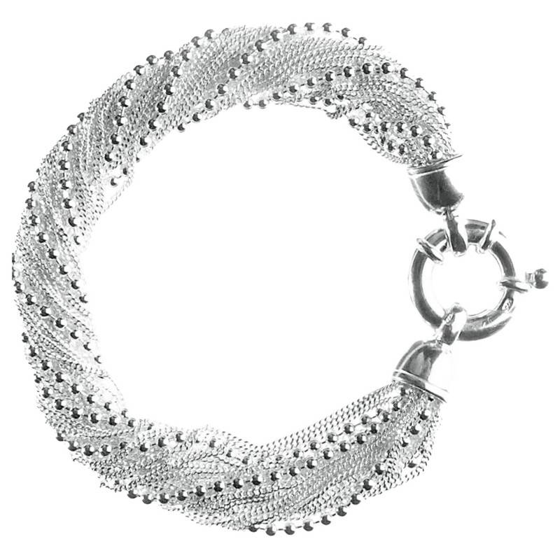 Ce bracelet en argent massif 925/1000 est un véritable témoin de vie qui sera inscrit au cœur de vos différents événements. Il combine 20 chaînes forçat de 1 mm entremêlées à 3 chaînes boules d'un diamètre de 1.8 mm et se ferme avec un anneau ressort. C'est une véritable pièce artistique qui pèse 18,5 grammes et fait 18 cm de longueur, qui ornera vos tenues avec brillance.