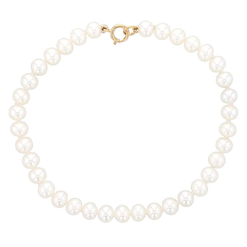 Ravissant bracelet en or jaune 750/1000 (18K) composé de perles d'eau douce en nacre blanche. Les perles, d'un diamètre de 4,50-5 mm, sont de forme semi-ronde. Ce bracelet d'une longueur de 18,50 cm est muni d'un fermoir mousqueton.